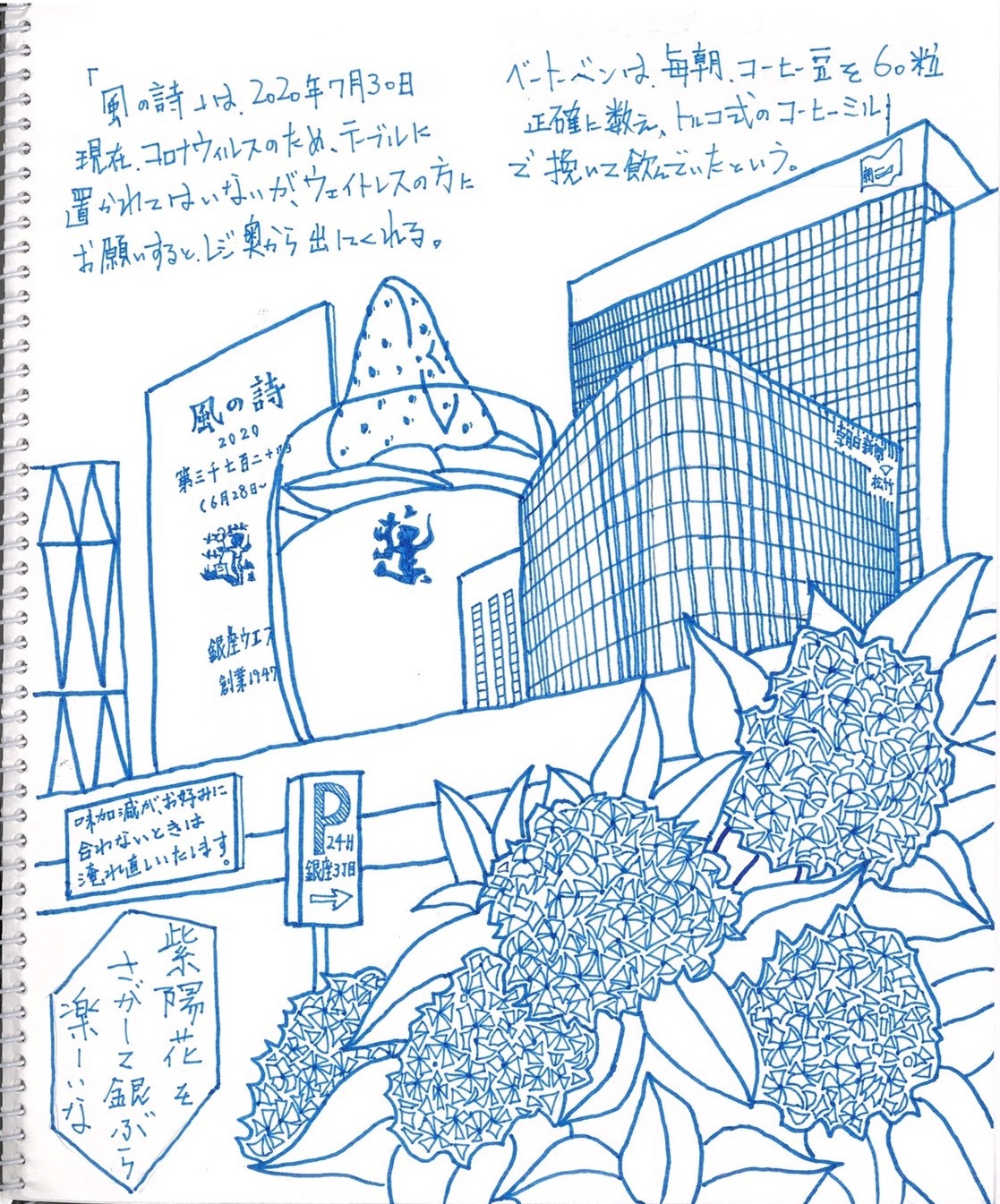 An hour and a half had passed since the start of our mission, and Bruckner’s Fifth had already sounded its last. The three of us reconvened at our agreed meeting point: the Ginza West parlor in 7-chome.*2 Our table happened to be by the bust of Beethoven. We called the waitress, ordered the cake and coffee set menu, then it was finally time to announce the final tally of Ginza’s hydrangeas, which was as follows: (Cue drum roll)