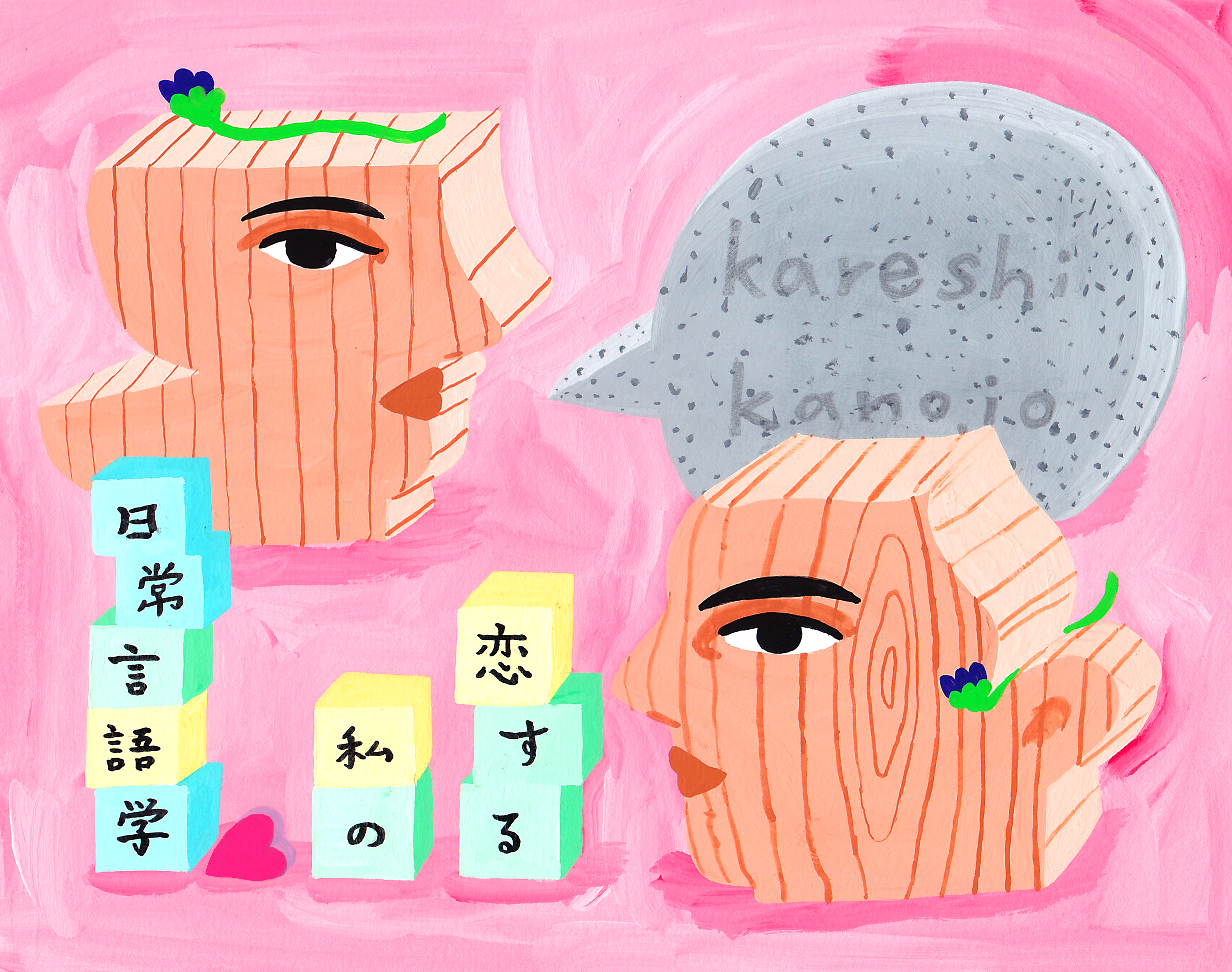 Tomoko Ogawa (TO): How you refer to a romantic partner reflects the nature of your relationship and your sense of distance from them. So, I think that everyone chooses their words carefully and makes certain distinctions when referring to their romantic partners, whether they’re conscious of it or not. For example, when you’re speaking Japanese, at first you might refer to someone by their family name, followed by the honorific suffix “-san.” But, when you become romantic partners, you might refer to them by their given name alone, or you might call them by a pet name. I think a lot of people have had that kind of experience. Many steps in that process can be embarrassing, and there are so many situations that can lead someone to feel uncomfortable or unsure of themselves. But, before getting into that, I know that you personally feel uncomfortable with the Japanese terms for “boyfriend (kareshi)” and “girlfriend (kanojo),” right?