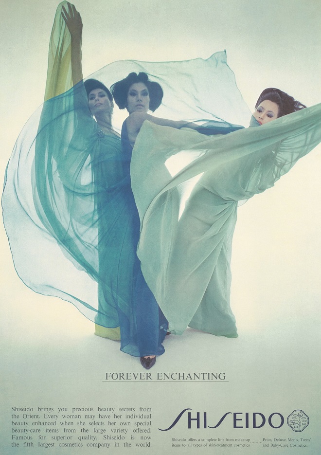 For many people in Japan, it was an age of hope and optimism in anticipation of the world’s largest sports event taking place in their nation. Japanese advertising designers were striving to develop content which would make the cut internationally. It was against such a backdrop that this ad was created, an experiment in strobe photography which was still rare in Japan at the time. The Shiseido team took on the challenge on hearing this method was capable of photographing people in motion, and adding to the outstanding young designers and photographers in the Shiseido Advertising Division (present-day Creative Division) was fashion designer Issey Miyake, a student at Tama Art University at the time, who provided the costume design.