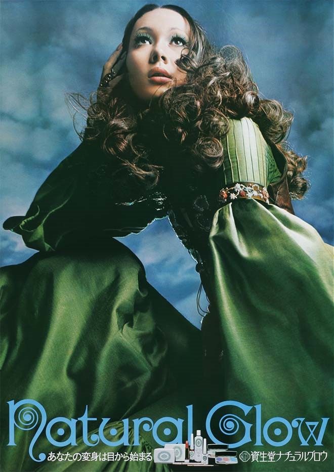 This ad, too, comes with the catch copy, “Your transformation starts with your eyes.” It encourages women to transform themselves in alignment with the changes in societal values. The visual is dominated by green, as if to symbolize the natural, and features the central figure of a woman in majestic repose, clad in an ethnic-accented hippie-style maxidress, directing her powerful gaze, shadowed in pale green, toward the future. It may be an ad for a cosmetic product, but the star of this visual is the very character and presence of one independent woman. It is a clarion call to women, urging them to free themselves from conventional ideas in more candid, dynamic forms of self-expression through makeup and fashion.