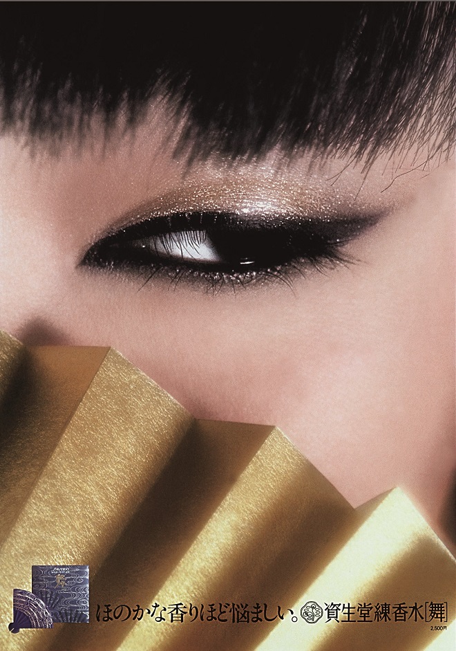 As extraordinary as she was as a model, Sayoko was also a performer with a mold-breaking career. She worked with the dance troupe Sankai Juku and preferred to call herself a “wearest” in her later years. In this advertisement, she reveals her mastery of physical expression: She enchants and allures with only her gaze. The graphic designer met her challenge with bold trimming, sublimating her beauty from instantaneous to infinite. The shadows dwelling in her gold fan and eyelashes, the subtle shimmer of her eyelid, the highlighted emphasis on the white of her eye, and the illumination on her fan – the world of light and shadow, depicted by graphic expression, further enhances Sayoko’s performance.