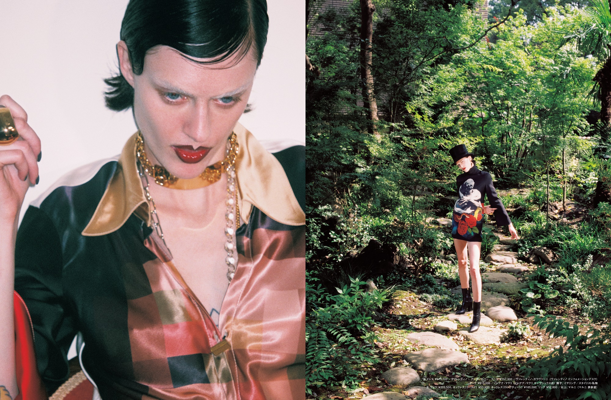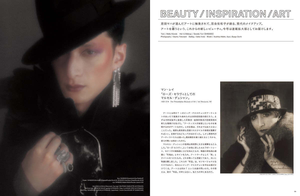 『花椿』冬号のテーマは「The Role of Art」です。表紙、巻頭では、25歳の新進気鋭の写真家、Arielle Bobb-Willis(アリエル・ボブ・ウィリス)さんが、岡本太郎やピカソなどが芸術について語った言葉にインスピレーションを得て撮り下ろしました。また、サイエンス、ソサエティ、ファッション、ヘリテージ、ビューティの5つのカテゴリーのアートに関するコラムや、これまで60年以上にわたって資生堂唐草を描き続けてきた、描版師・薄希英(すすき・まれひで)さんが『花椿』のために描いた新しい唐草「Forest of Karakusa」を掲載しています。巻頭のArielle Bobb-Willisさんの撮り下ろし写真と「Forest of Karakusa」は、ポストカードとして付録に封入しています。さらに、連載『サロン・ド・バー 花椿』では、世界的に活躍する建築家・石上純也さんをゲストに迎え、Charaさんと対談、ビューティ連載は、拡大版として、資生堂ヘアメイクアップアーティストの百合佐和子が、マルセル・デュシャンがローズ・セラヴィと名付けた女性に扮した作品を題材に、メイクアップを提案しました。