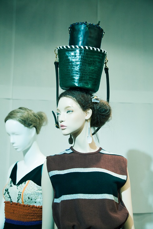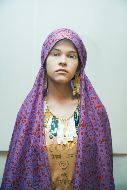 漂流物からインスピレーションを受けたというアクセサリー、バックの小物使いは、猫のテレホンカードのピアスを装着したり、漂着したゴミ、スモーキーマウンテンから拾ってきたという見立てのバッグを頭にのせたりなどユニークで、今回のコレクションテーマを感じることができる。