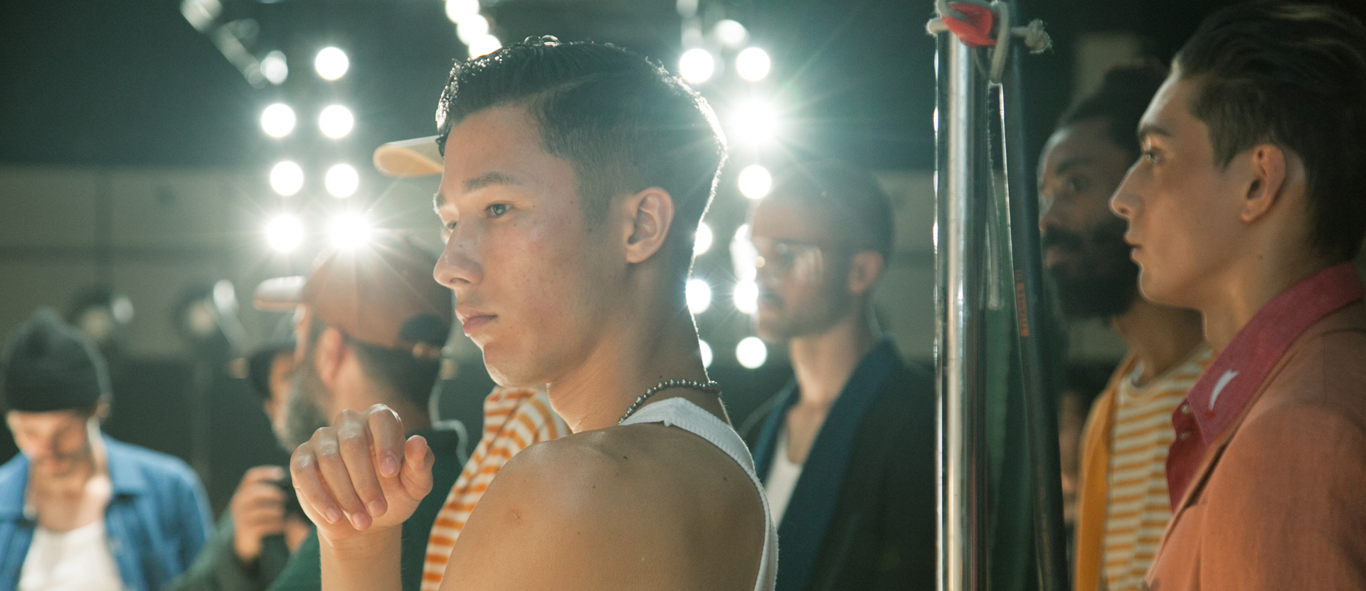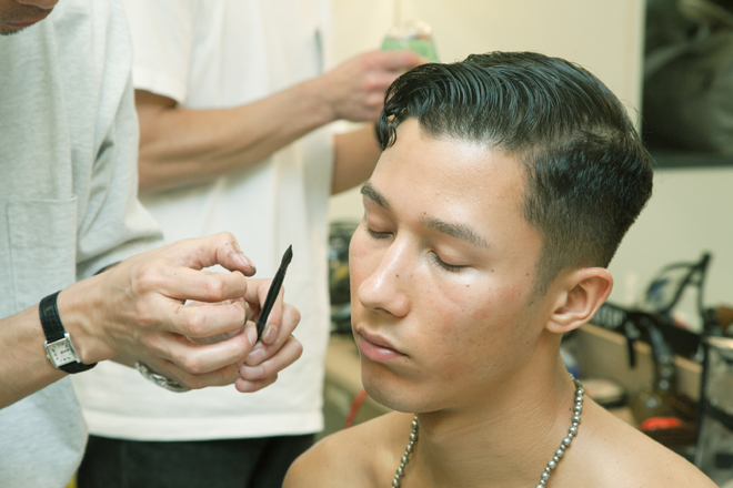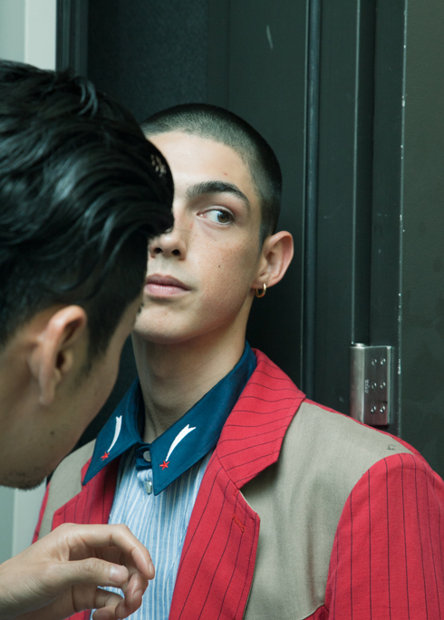 テーマは“Los Bastardos”。できそこない・畜生、といった粗野なイメージだ。東京の街でスカウトしたアマチュアも混じるモデルたちはラフで、好戦的な印象。彼らのそのままの雰囲気を活かすかたちで、ベースの肌とヘアはナチュラルなスタイリング。ポイントを肌のムラのつくりこみに置いた。南米の照りつける太陽を浴びて自然にできたそばかすや赤みなどを、まゆずみとブラシなどで演出。若く、健康的な印象が際立つ米南部の不良風に仕上げた。