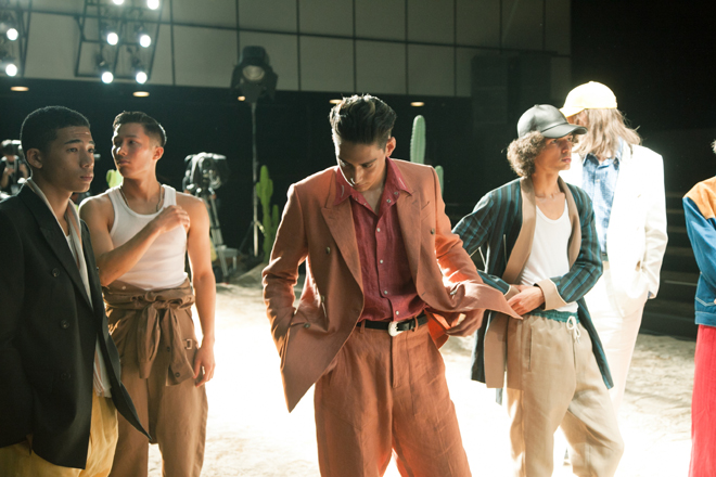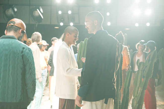 南部のリズムにのって、サンドカラーや陽で退色した独特の暖かい色味のセットアップやウエスタンシャツ、ナチュラルシルエットの白地のパンツ、インディゴカラーのアイテム、そして直接的に太陽とサボテンを描いたニットジャケットなどが登場。インナーのタンクトップやややルーズなトラックパンツ、モデルたちの気取らずに歩く格好に現地の臨場感がある。