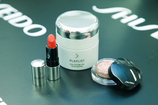 高揚感あふれるメークをパーツごとに見てみると、特に目を引くのが、滲み赤リップ。ワントーン明るめの赤は、血色感があり強い色でも肌に馴染むので、表情がぱっと明るくなる。そしてアイシャドーは、オレンジブラウン。質感は、マットではなく、シアー感があるものをチョイス。陰影をつけることで、目元を優しく、そして無難な色に収まらないことで、今らしいハイセンスな顔立ちに仕上げている。肌は艶のある健康的で透明感のあるタッチ。人工的ではなく、自然の肌を生かしたような軽い質感に仕上げ、大人のピュアさを感じさせていた。