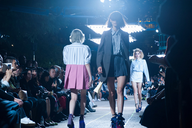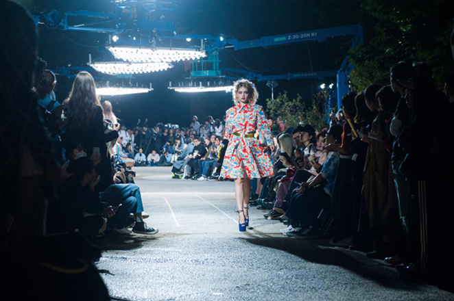 ミキオサカベが今シーズンのテーマに掲げたのは時代のリミックス。1970、1980、1990年代の要素を集めて、再編集したコレクションだ。80年代を象徴する、肩を強調したボックス・ジャケットや、上半身のシルエットが大きいにぎやかな西海岸風のパターンのワンピース、歌謡曲をラブリーに歌い上げる歌手さながらのスパークルなミニドレス、そして90年代のロング&リーンなノースリーブ・ジャケットスタイルなど、時代が偲ばれるルックが登場。足元はすべてハイパー・プラットフォームで統一され、各ルックがフィギュアとして強調されている。デザイナーの坂部三樹郎は「各年代のすてきなところを集めてみたらどうなるか、試してみた。70年代風、80年代風、90年代風のルックがショーの連なりの中でひとつの風景に収まったときに、どんな気分になるのか。それを観客の方に感じてほしかったんです」と語るように、各年代が入り混じる光景は映画『バック・トゥ・ザ・フューチャー』三回分を一気に体感するような、楽しい錯覚があった。