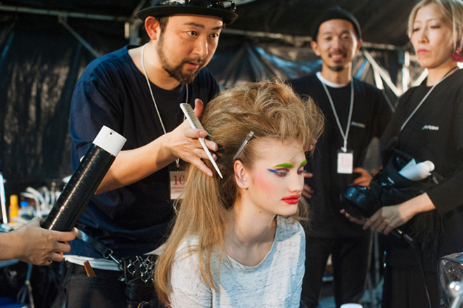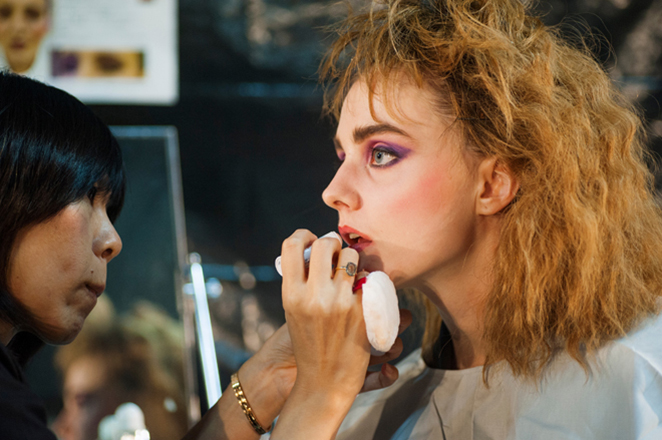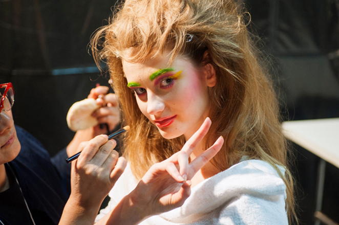ショーが終わったあとのバックステージは、ショーの余韻に浸るまもなくメーキャップ用具の後片付けなどの撤収作業に追われる。通常、モデルはメークを落として次のショー会場に移動する(今回は最後のショーだったので帰途に着く)のだが、今回、その作業になかなか取り掛からないモデルがいた。「私ほんとうにこのメーキャップが好きなの! 落としたくない!」と言っている。彼女のメークは、濃いパープルのアイシャドウにローズのリップを合わせて、ほお骨にそって鮮やかなホット・ピンクのチークが大胆に走っている。ヘアはブロンドのソバージュをバンダナでハーフアップする、いわゆる80年代のスタイルである。