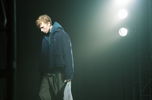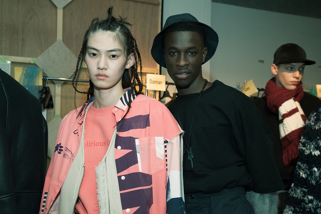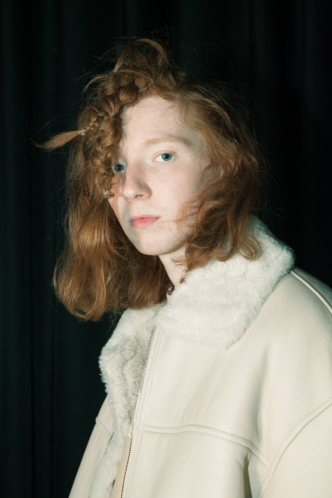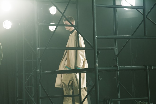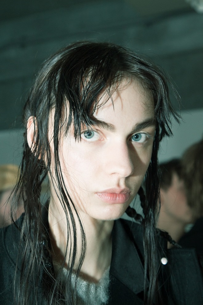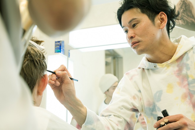 ストリートモードのコレクションに合わせたメーキャップは、ごくナチュラルで、化粧っぽさを感じさせないトランスジェンダーな印象。ベースは、厚塗りを防ぐために肌あれをカバーしつつ、本来の肌色のワントーン明るいファンデをなじませ、素肌感を引き出す。ポイントメークは、地毛を生かしたアイブロウ、チークもリップも色をあえて使わず、目元はウィメンズのみはアイラインをON。無機質に見えるメークだが、モデルの個性に合わせて、ミニマムなポイントをそれぞれ作ることで垢抜けた雰囲気に仕上がっている。
