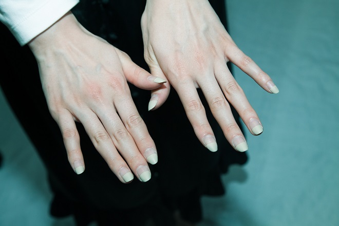 ネイルはツートンカラー。上はマットなベージュ、下は自爪という組み合わせが新鮮に映る。質感をマットにすることで無機質なイメージを引き出し、主張をしないが、服とマッチしたポイントとなっている。