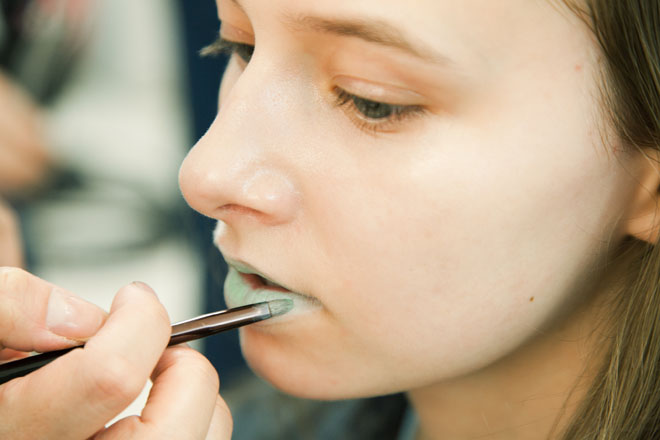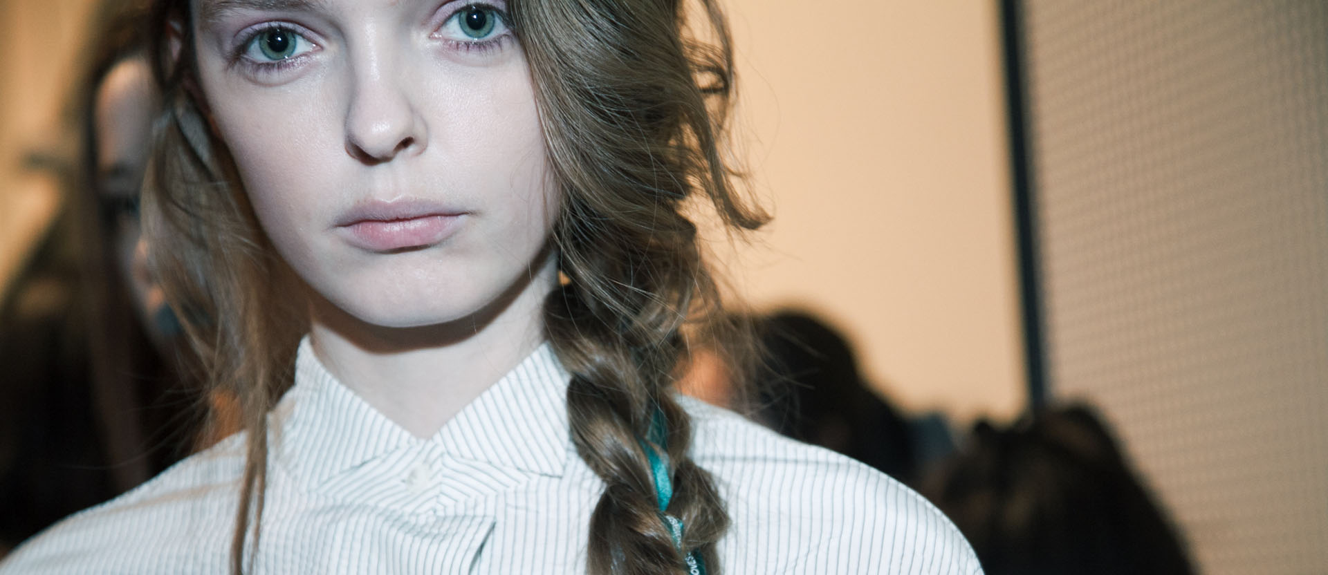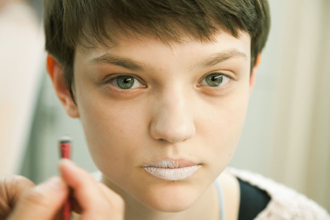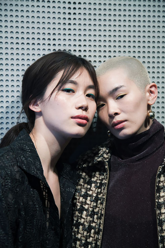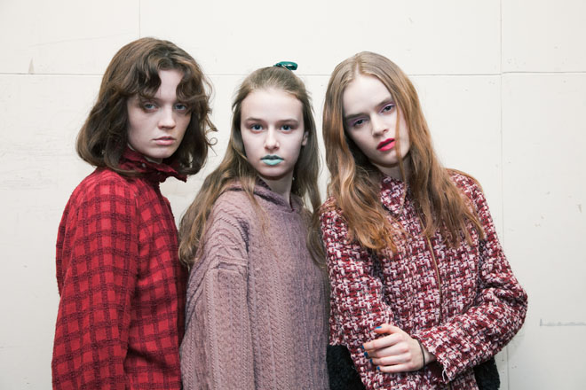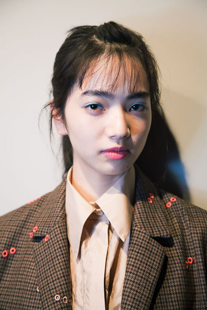 子ども心の演出にはヘア&メーキャップも一役買っている。小さい頃に母親に結ってもらったようなルーズな三つ編みやハーフアップ、色とりどりのカラーが踊るメーキャップなど、無邪気な遊び心とノスタルジーを感じるヘア&メーキャップ。「今回は個性を活かして、一人ひとり異なるヘアスタイル&メーキャップを施しました。その様ざまなスタイルを統一するのが、“パステルカラー”のワンポイントメーキャップと今回ティート トウキョウが特別に作成した“リボン”。パステルカラーの色遊びや自分でメークを施したようなラフなタッチを演出することで、ティーン特有のプレイフルな雰囲気を表現しています」(豊田健治・資生堂ヘア・メーキャップアーティスト)