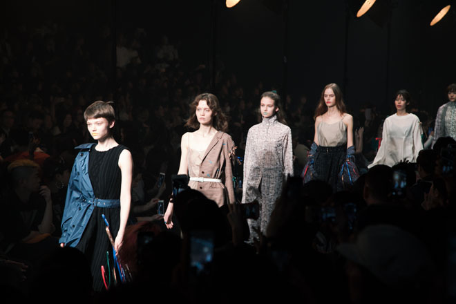 衣服の要所要所に編みこんだリボンや、素材の妙を活かした多種多様なオリジナルテキスタイルなどティート トウキョウを象徴するポイントを織り交ぜながら、今季はモーヴピンクのフードつきのアランセーターや、パジャマ風のモヘアジャケットなど、シルエットに適度な緩さをもたせたガーリーな、またノスタルジックな雰囲気をたたえたアイテムを揃えた。