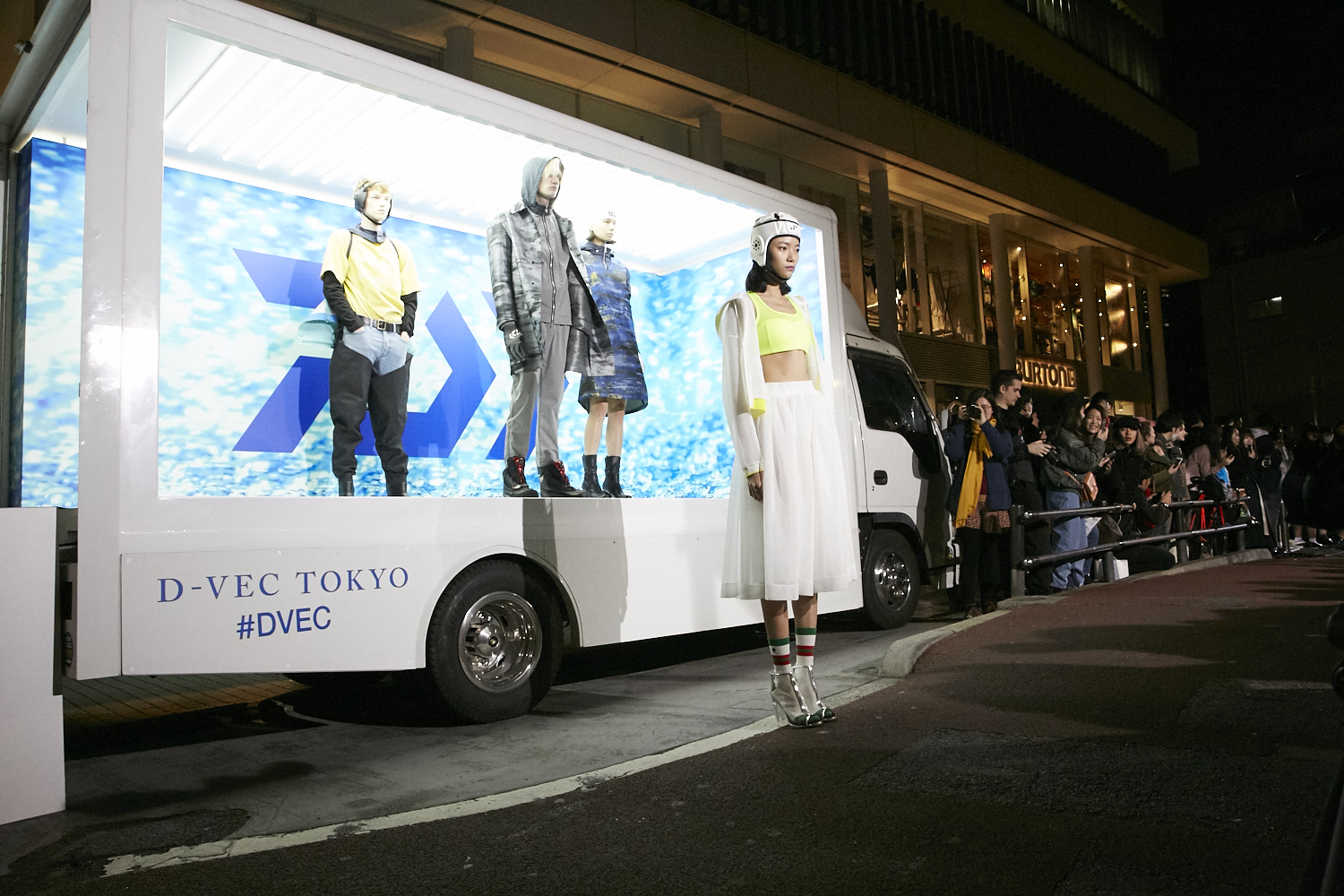 原宿キャットストリートを舞台に行われた、D-VECのショー。ロゴが大きく描かれたトラックがステージとなっており、ストリートをランウェイにモデルが登場する演出は行く人々の目を引いていた。春に新しくスタートしたD-VECは、釣り具用具で有名な"DAIWA"が、その機能的なノウハウを生かしデイリーユースにおとしこんだ服を展開するブランドだ。ブランドが打ち出す "雨の音を感じ 風を楽しむ 五感を通して、すべてのシーンを瞬間に感じとる"の言葉にもある通り、自然環境の中でも快適に過ごすことができるウェアが揃う。