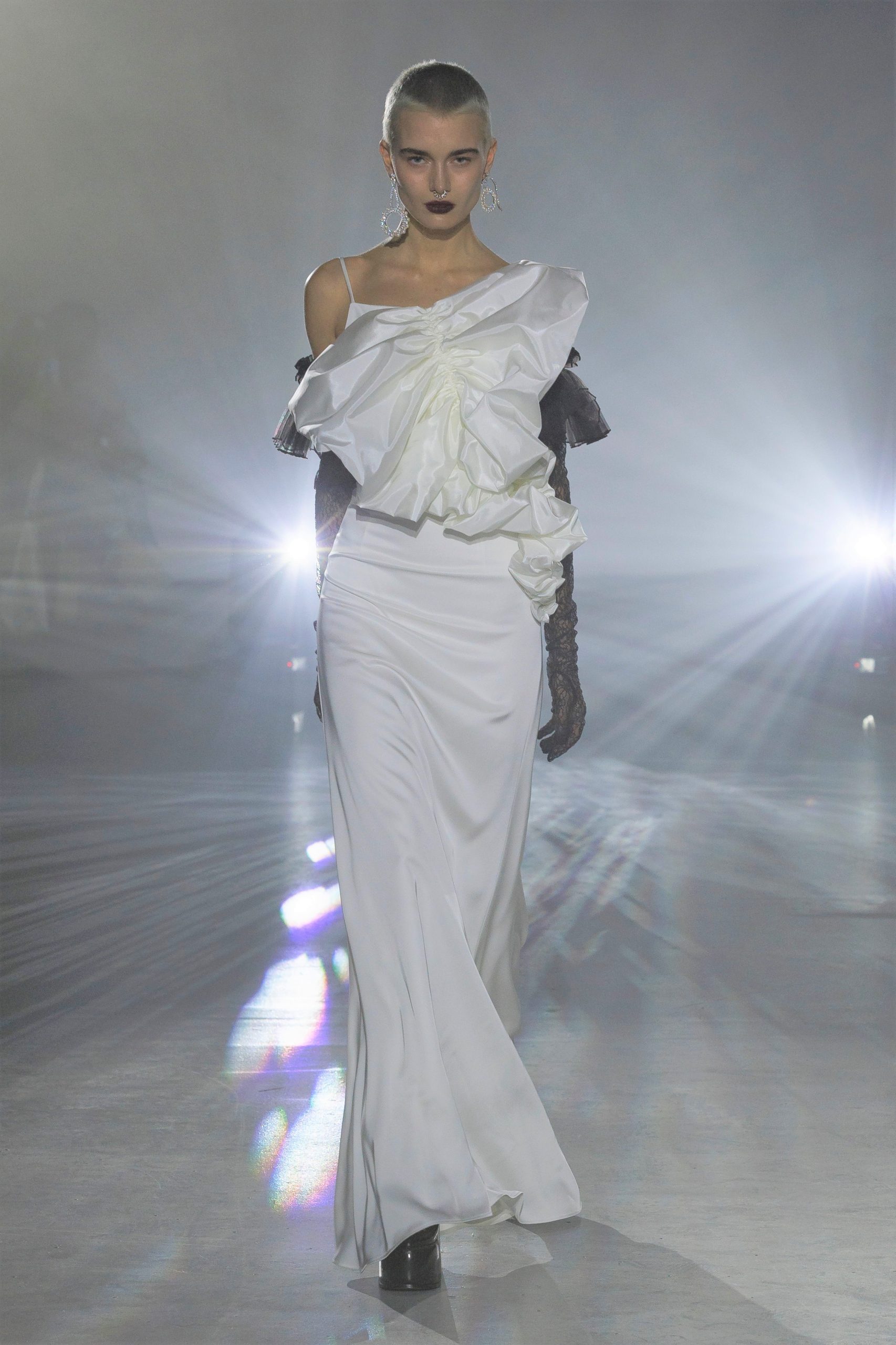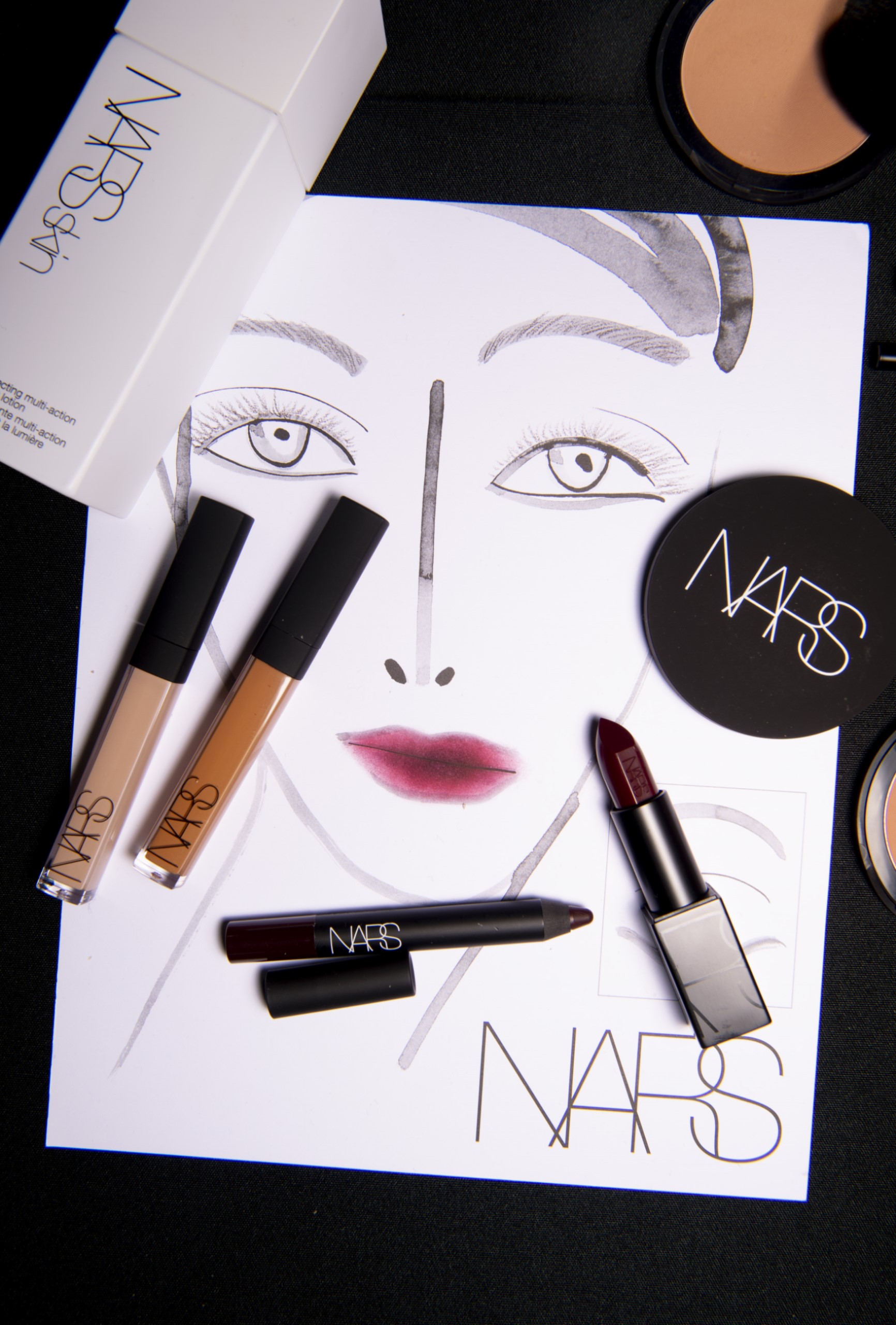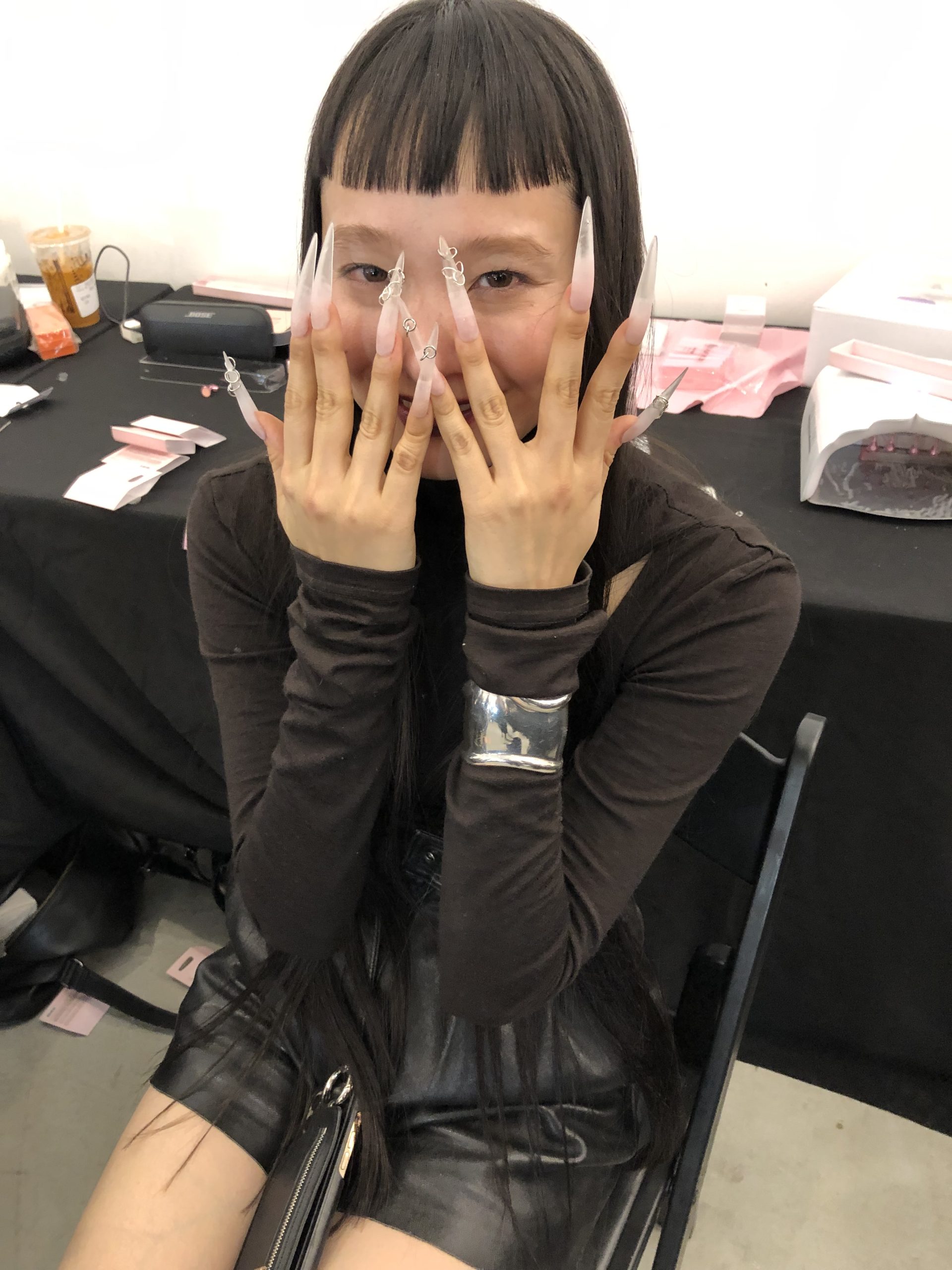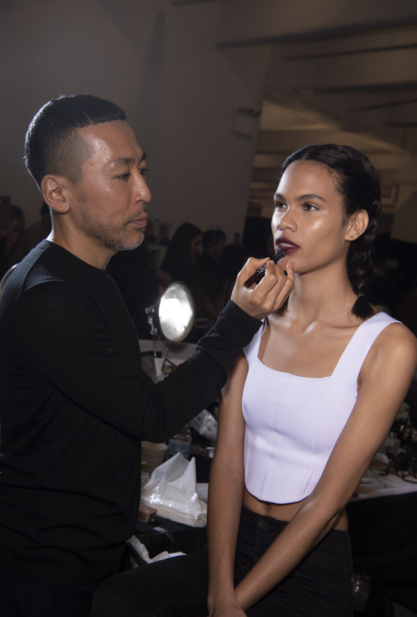 「ADEAMガールには透明感が絶対!」と語るのはメイクを手掛けたNARSグローバルアーティストリーディレクターの伊藤貞文。バーガンディの口もとはシアーなリップを塗ったあと、同色のペンシルで中央に色を重ねラフに指でなじませる。ハイライトでデューイ―な肌作りもあいまって、ゴスメイクがイノセントな印象に。
