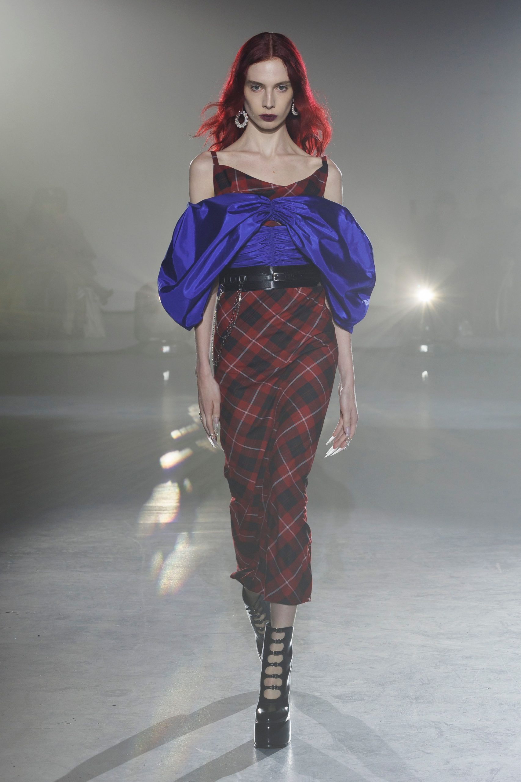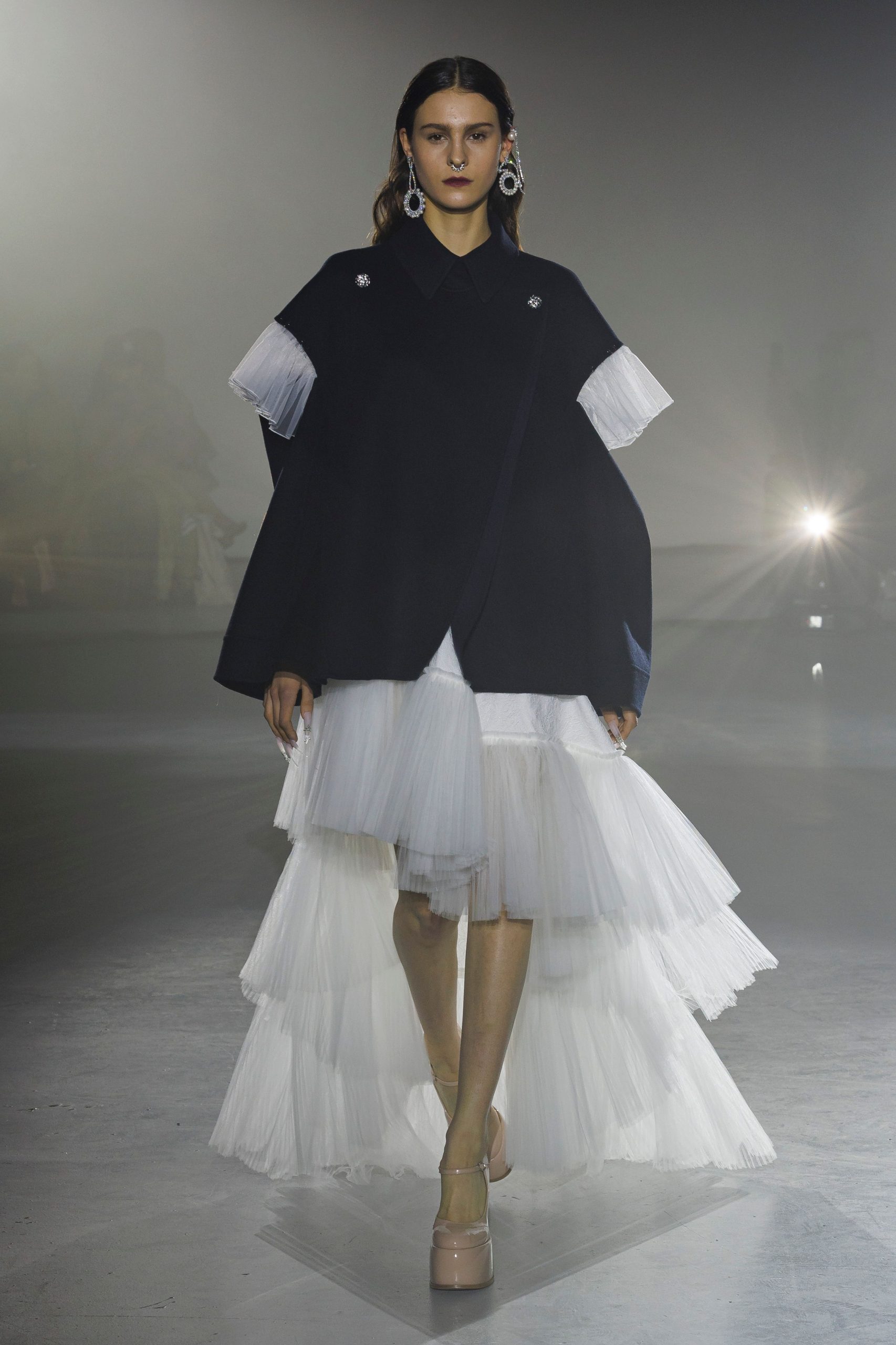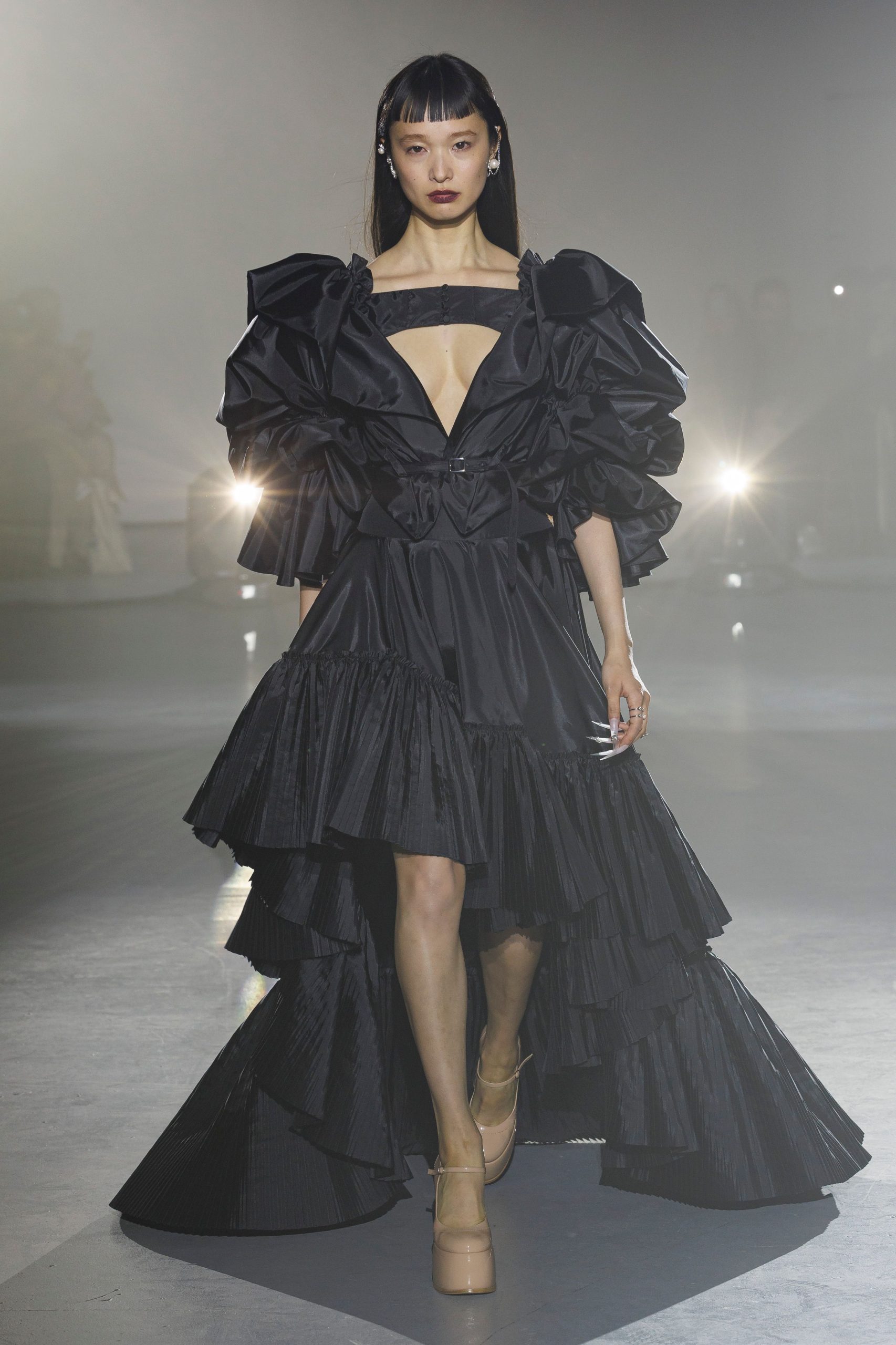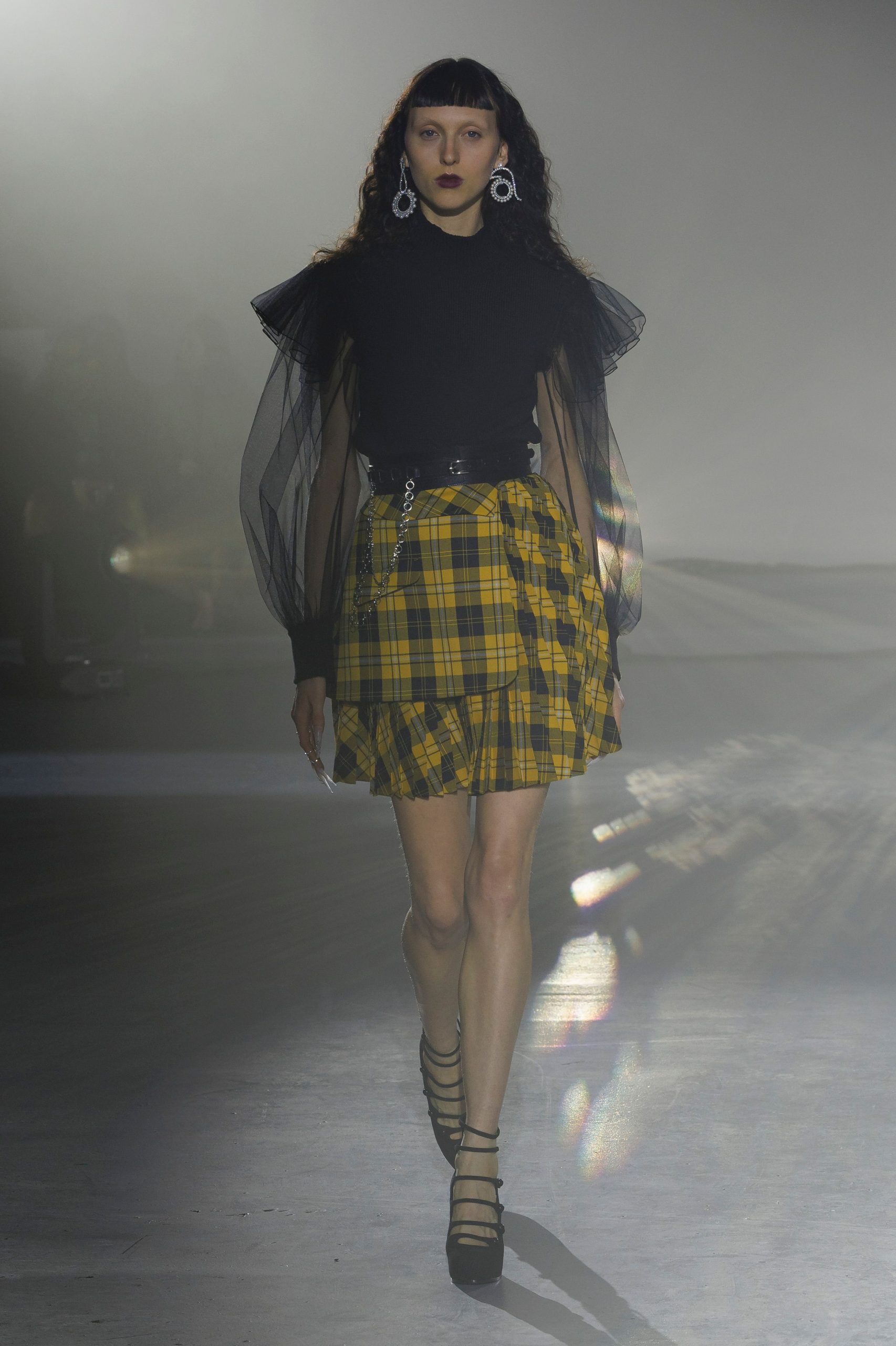 「ADEAMガールには透明感が絶対!」と語るのはメイクを手掛けたNARSグローバルアーティストリーディレクターの伊藤貞文。バーガンディの口もとはシアーなリップを塗ったあと、同色のペンシルで中央に色を重ねラフに指でなじませる。ハイライトでデューイ―な肌作りもあいまって、ゴスメイクがイノセントな印象に。