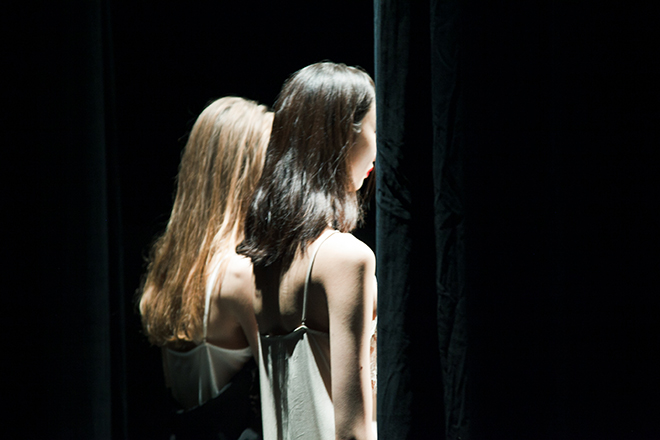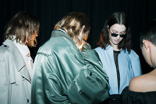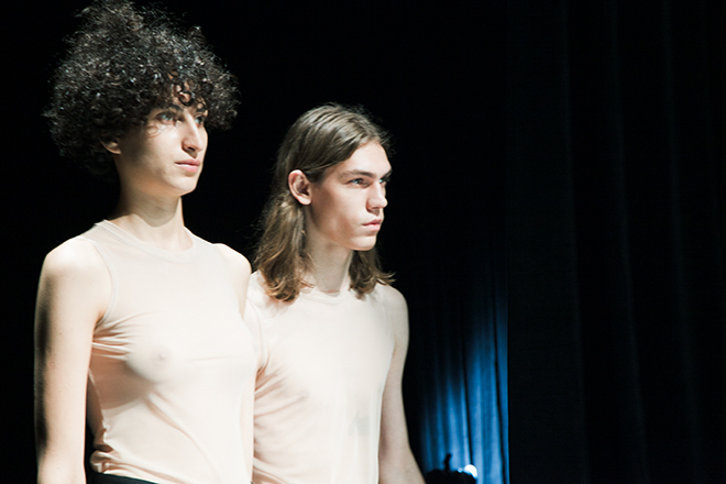 モノトーンとヌーディーカラーを基調に、深いスリットの入ったランジェリードレスや軽やかな素材のトレンチコートなどを提案したDRESSEDUNDRESSED。全体はミニマルシックな趣だが、男性モデルはオーバーサイズめのトップスにボトムはショートパンツを合わせたり肌着のみだったりと肌の露出が図られたことでユニセックスな印象に。そして一方の女性モデルはダンディなスーツのセットアップやオーバーサイズのデニムジャケットなどをまとうことでマスキュリンな印象が強まり、時折、男女、女女、男男が二人ずつ、ほとんど同じルックで登場する演出は性差を明らかにしつつも、その差が個性に転じて結局性差があいまいになるような効果を生んだ。