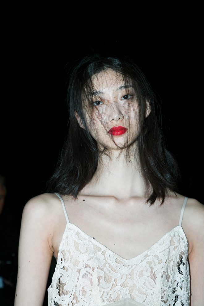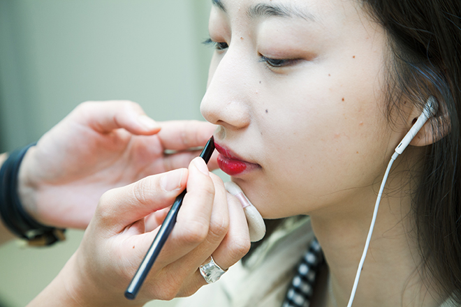 モデルは一様にファンデーションを重ねたマットな肌。グロスも色もなし。均一化されることでむしろ、一人ひとりの個が際立つような演出だ。その中で一人、赤いルージュをまとった女性が登場するのだが、均質の静けさを破るように、その赤いルージュには力強いムードがあり、改めてその魅力を感じさせた。赤いルージュはトレンドレスなアイテムとして、日常でまといたいひとつ。