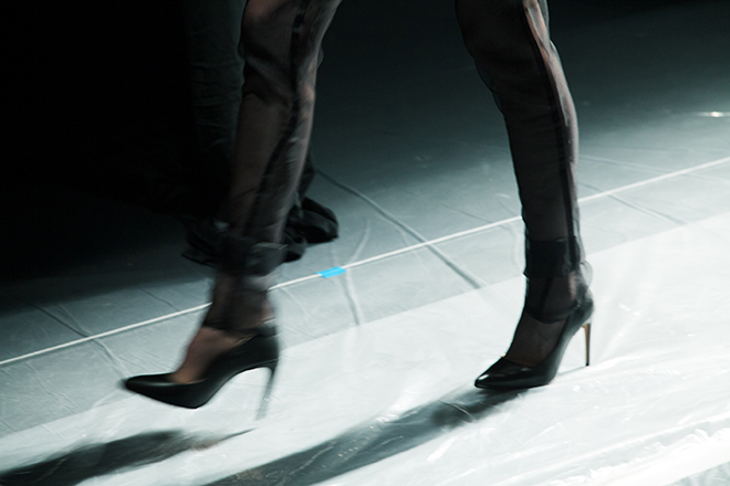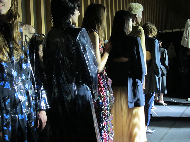 現在はコレクション発表の場をロンドンに移しているTOGAがブランド設立20周年を迎え、国立新美術館を舞台に凱旋ショーを行った。メンズのテーラードジャケットをロングコートや袖をカットしたベスト風、クロップド丈にするなどアレンジを加えたトップスに、ハイウエストのゆったりしたパンツやプリーツのロングスカート、シアーな素材で抜け感を演出したパンツなどを合わせたスタイリングは、潔く、アダルトな印象を強調。ブルー、グレーの色調から徐々にチェックやアート作品のようなポルカドットなどのパターンが登場し、ギャザーの妙が効いたアシンメトリードレスや、ビニール素材のスカートなど実験的な要素と相まって、力強いスタイルを提案した。