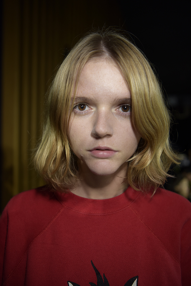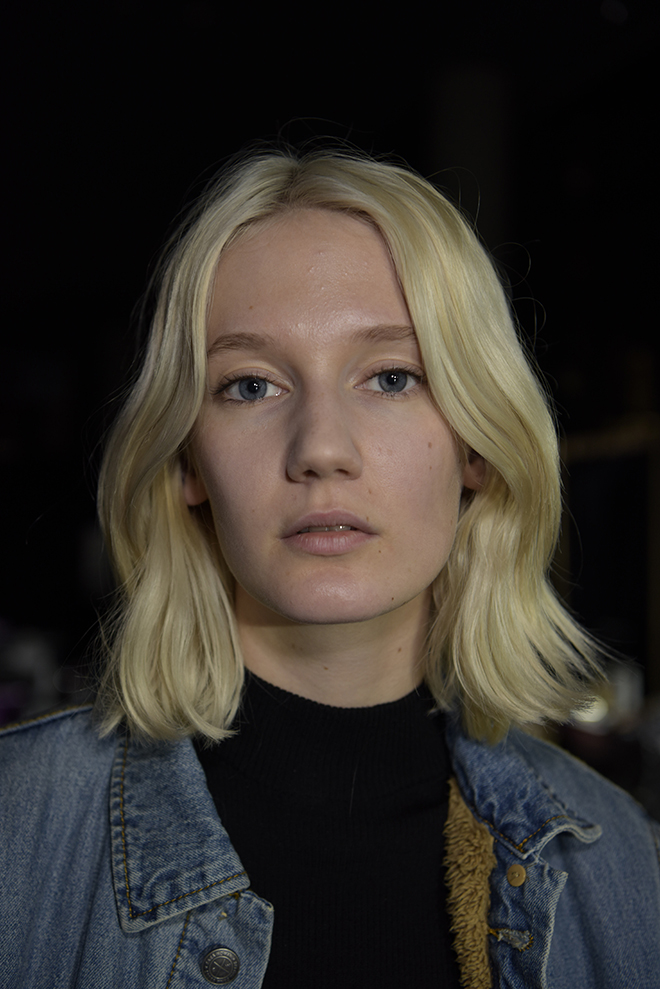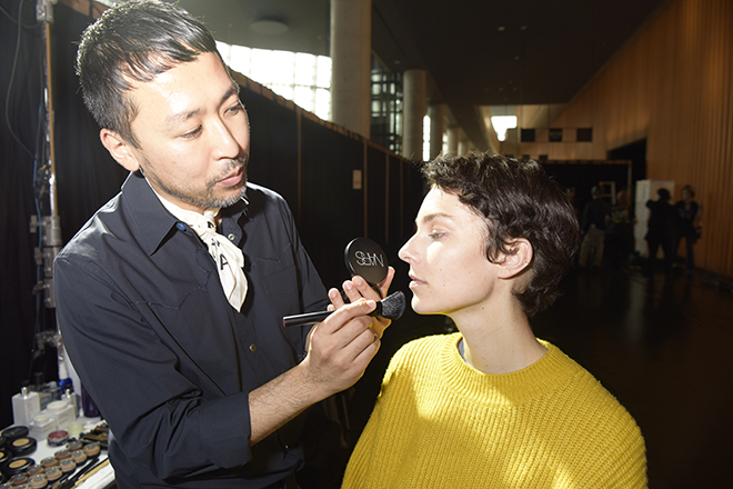 その強いスタイリングにあわせるメイクは一見、ノーマルなナチュラルメイク風。しかしよくよく見ると、ナチュラルなムードの中で目元だけが自然にくっきりと強調されている。目元を強調するというと、一般的には目周りを過剰に作りこむようなイメージを思い浮かべるが、今回の方法はそのような“足し算の強調”ではない。むしろ目元にはほとんど何も施さずに目元以外の印象を“抑える”ことで、目の存在感を高めるという発想の転換がなされている。キーアイテムはルースパウダー。目の周りに丁寧に塗布することで、目元だけをくっきりと浮き上がらせるような効果を生む。強調したいパーツをさりげなく目立たせるこの方法は、ほかのパーツにも応用できそうだ。