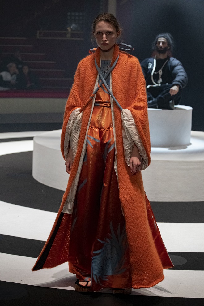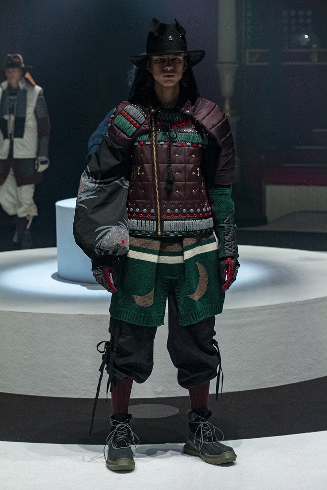 日本文化のエッセンスは日本人デザイナーであれば、自ずと頭や感覚に染みついているだろう。とはいえ、彼らが和装モチーフに正面から向き合いモードに昇華させるのは、実は、とても珍しいこと。90年代から活躍するアンダーカバーのデザイナー、高橋盾も、『蜘蛛巣城』の登場人物が着る鎧兜(よろいかぶと)や着物など和装からコレクションを着想するのは初めてだ、と『Vogue Runway』に語っている。