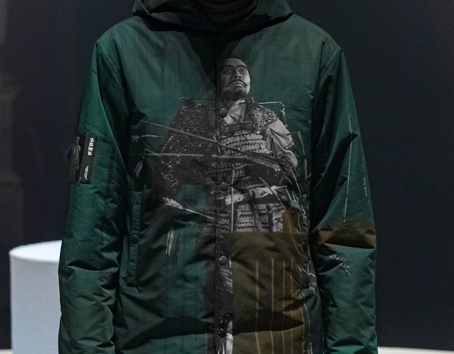 たすき風の紐づかい、着物の衿合わせのようなVネック、ムカデやウサギを模した家紋プリント、着物スリーブ、裁付袴ジョッパーズなど、さまざまな和のモチーフが登場する。