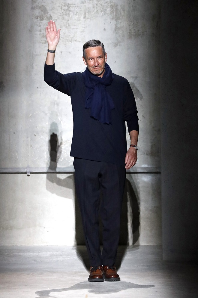Dries waves to the crowd at the show’s finale, wearing his trademark navy blue and a serene smile.