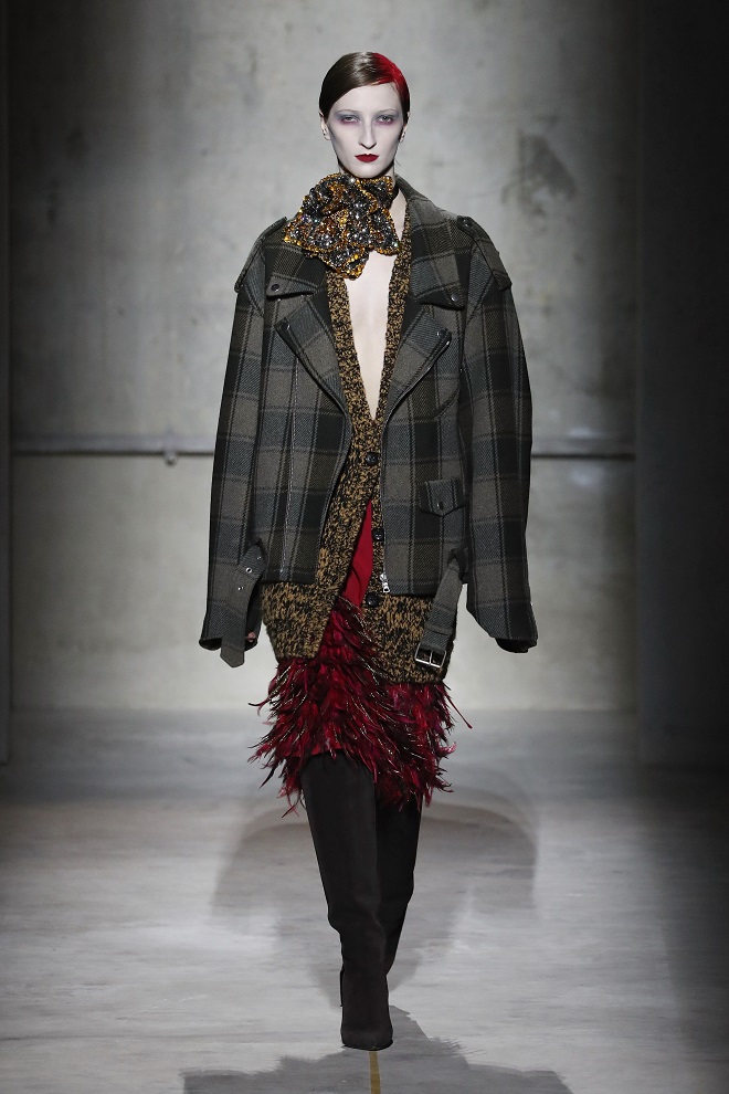 The first look of the latest collection. The flamboyance of the sequins and feathers is toned down neatly by the restrained plaid.