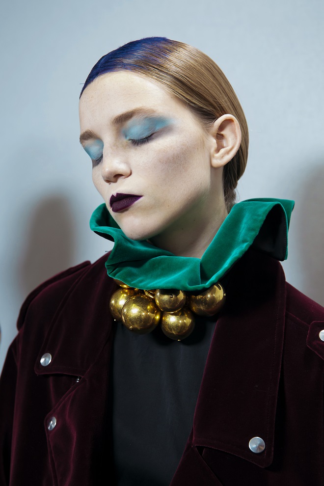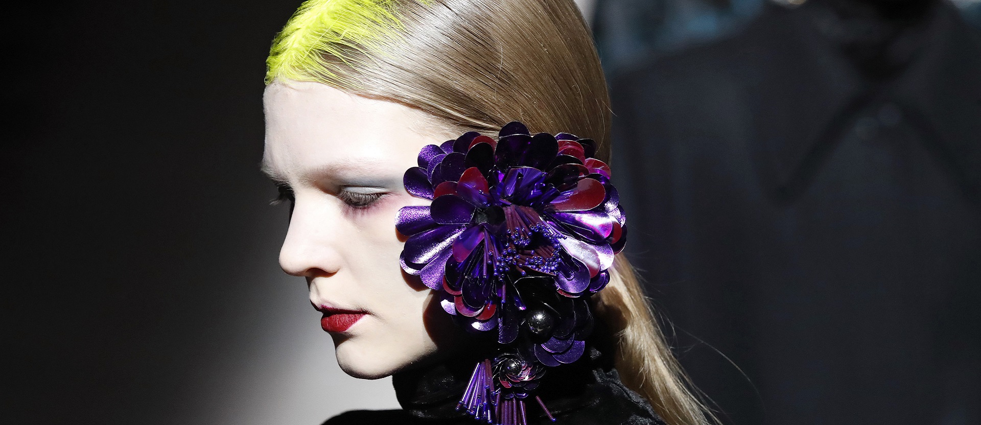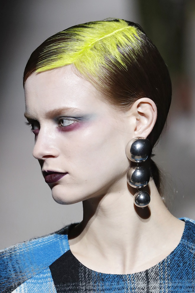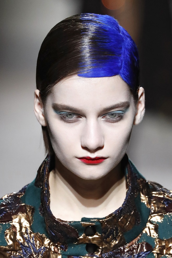 The sleek, tightly combed-down hair evokes the glam mood of the ’80s with its electric colors, applied at the roots rather than the tips in a creative twist.