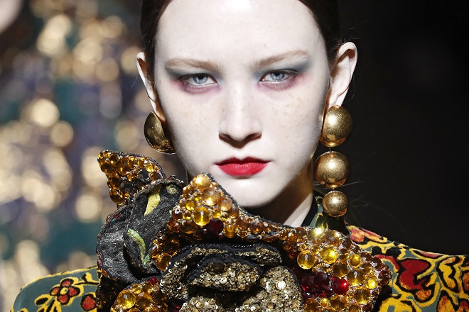 The Lutens aesthetic could also be found in the runway show’s hair and makeup – courtesy of Sam McKnight and Inge Grognard respectively – which offered a contemporary take on his mysterious beauties.