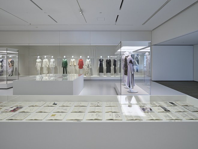 展示の中でとくにご紹介したいのは、会場中央に設けられた創作の「ノート」。ブランド創設の前から書き溜め、ひとつのコレクションにつき1冊をまとめているという記録の数々は、スケッチや生地サンプルに交じって身近な人とのふれあいや日記のような手記がつづられており、黒河内さんが創作の背景にめぐらせていた考えや感情を感じられる貴重な資料となっています。たくさんの記録の中に見つけたのは、「精神的に豊かであるものづくり」ということば。おそらくブランドを立ち上げた初期の記録とみられますが、ノートのまわりに並べられた、そのことばを見事に体現するような精緻な作品に、マメ クロゴウチの実り豊かな10年を感じられるはずです。