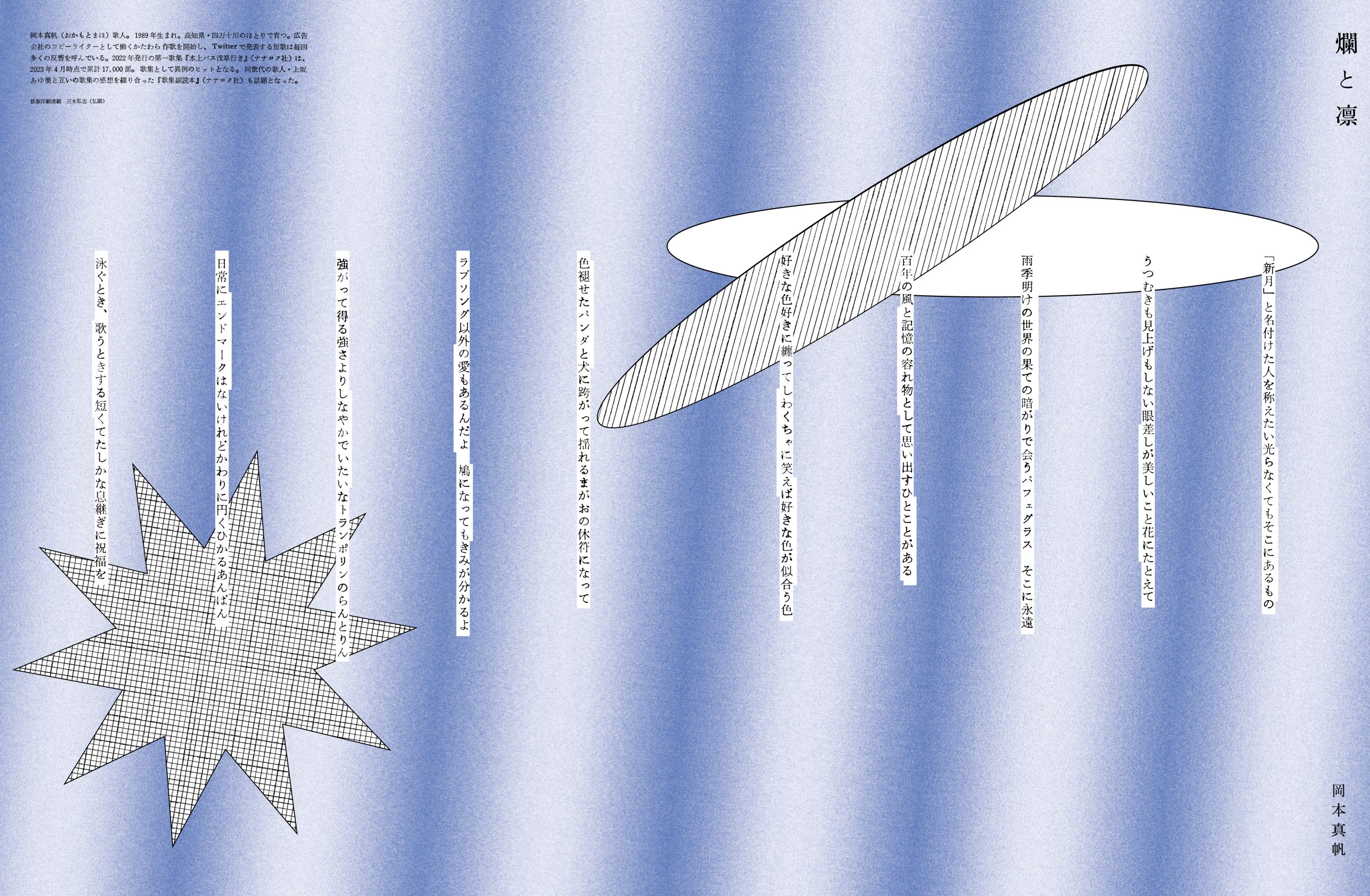 花椿2023年号(No.831)「OUR ENERGY」に、短歌「爛と凜」を寄稿いただいた話題の若手歌人・岡本真帆さん。作品にこめられた岡本さんのエナジーに迫ります。