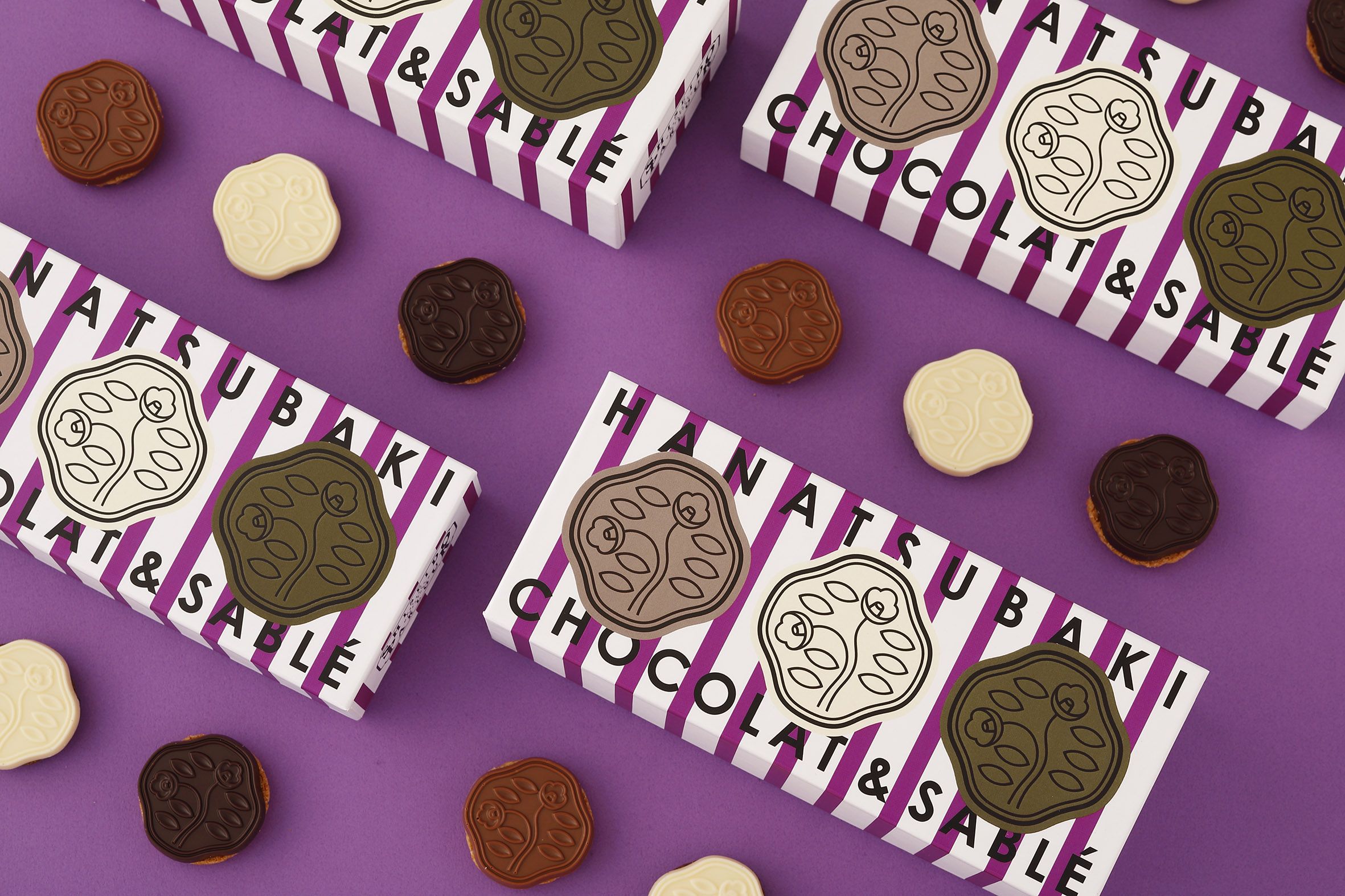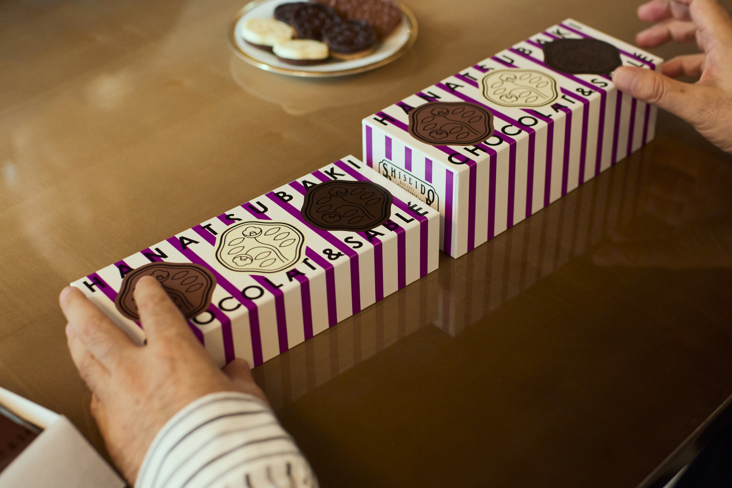 濃い鮮やかな紫色のストライプの上に黒い文字で、商品名の欧文文字「HANATSUBAKI CHOCOLAT & SABLÉ」が入る。その上にまるでシールをペタリと貼ったように、三つの花椿マークが並ぶ。一見すると非常にスタンダードなデザインのようにも見えるが、ストライプの線と商品名の文字が干渉していたり、文字の上にロゴマークが一部かぶさっていたり。やっぱりこれは「銀座アヴァギャルド」のシリーズだと納得する。服部氏は、デザインを進めていく過程で、資生堂パーラー側に背中を押された部分もあったと話す。
