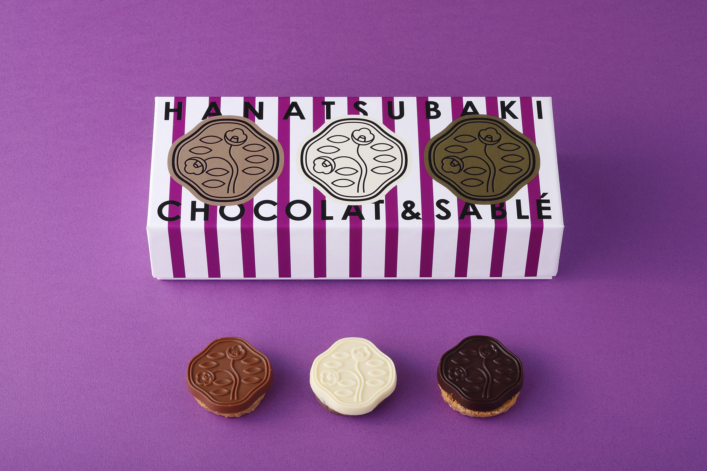 「花椿ショコラ&サブレ」は、全粒粉も使用したバターサブレと3種類(オレ、ブラン、ノワール)のチョコレートを合わせ、花椿マークをかたどったお菓子。資生堂のシンボルマークである“花椿マーク”を前面に押し出し、「銀座アヴァギャルド」シリーズでも印象的に用いられているストライプを用いた。