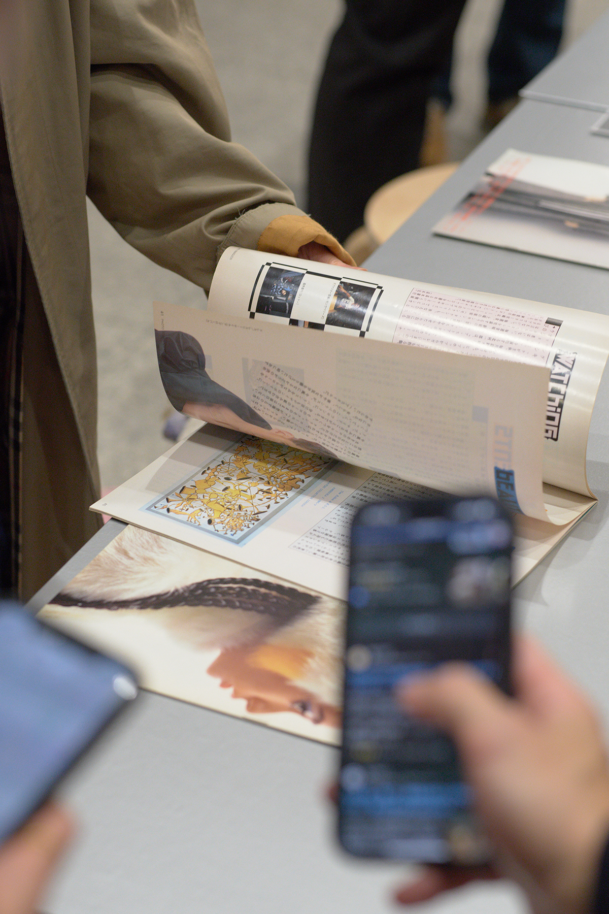 花椿は、23年のゲストカントリーであるノルウェーから招かれたパブリッシャーで編集者のエリス・バイ・オルセンさんとともに、タブロイドを制作しました。このプロジェクトは、花椿のアーカイブをリサーチすることで、過去と現在をつなぐ試みです。また、エリスさんがディレクターを務めるファッションリサーチ国際図書館から着想し、今回のブースではその図書館の雰囲気を再現しました。