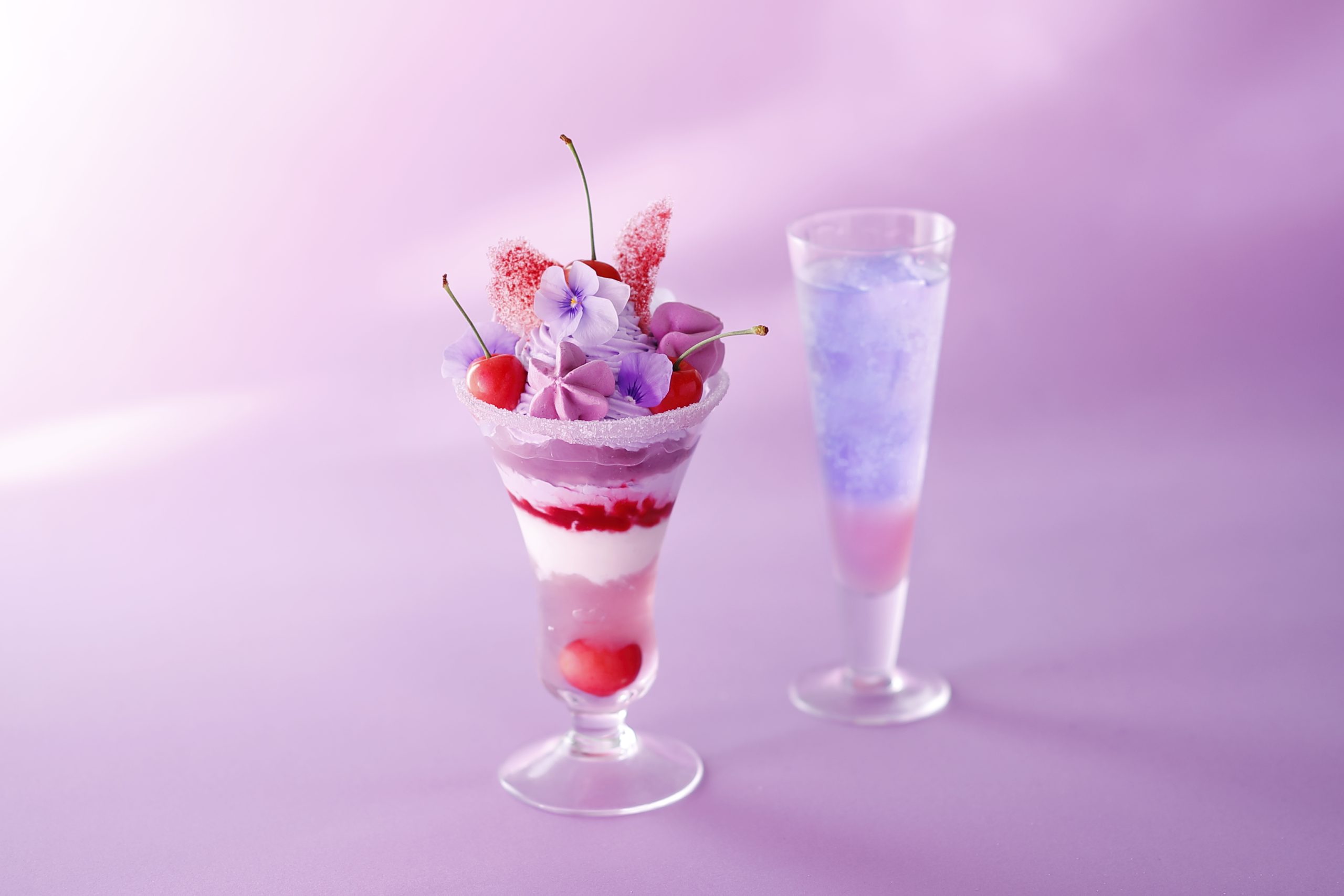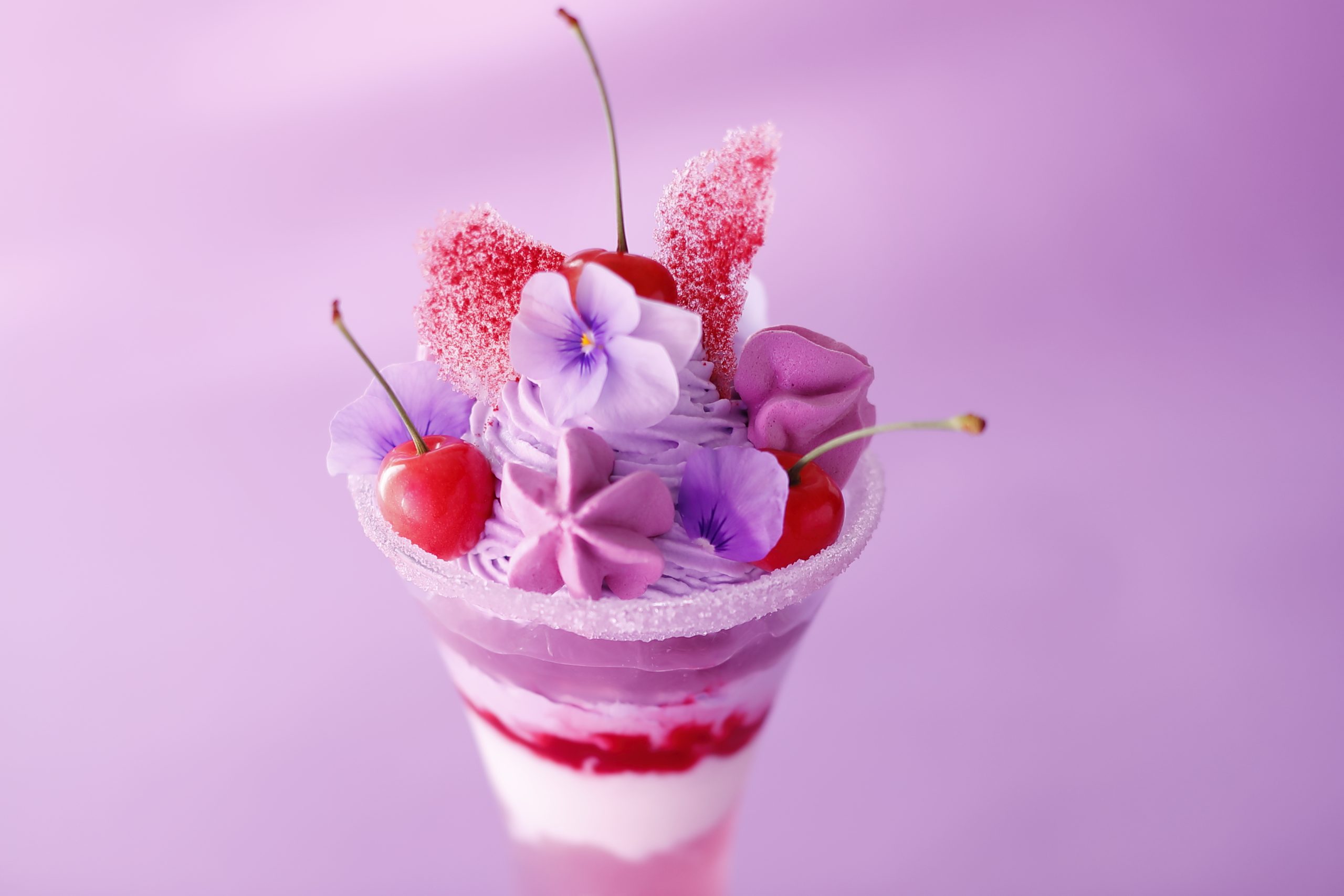 “恋の味”の果物言葉を持つさくらんぼのフレッシュな赤と、上品なすみれ色が組み合わされた、まさにときめきを体現したようなパフェ。