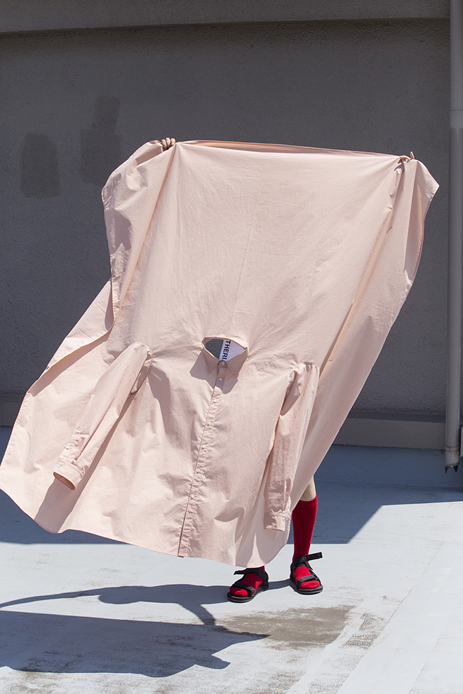 濱田「そういわれてみれば私には、服を通して日常にハプニングを起こしたいという気持ちがどこかにあると思う。劇場や映画館とかに非日常を体験しにいくのもおもしろいと思うけど、その人の暮らしのなかで何かが起ったらおもしろいな、と。だからTHERIACAの服にもひそかに違和感を仕込むことがあって、私の服を着ている人から“この服を着ているとよく声をかけられる”と聞いたりすると、すごくうれしいんです。それは何かが起きたということ、違和感が効いているということだから。今回は機能的な服をつくらなくてはいけない、という制限がない状態でつくれたので、違和感だらけかもしれません。服をつくる仕事をしていると、アイデアをセーブすることなく表現してもいい機会って、あんまりないんです。でも今回は、いつも以上に新しいことに挑戦して、自分の間口を広げるという作業が大胆にできた。つくっていてとても楽しかったし、こういった作業から新しい発見や次のコレクションにつながるようなアイデアも生まれてくるんだなあと改めて思いました。とても有意義な制作時間でした」