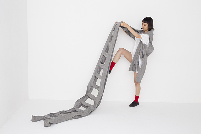 「THERIACAの服はいろんな人に着てほしい。もしファッションの枠やトレンドを気にしている人がいたら、私の服を着て少しでも自由な気持ちになってもらえたらいいな」——そう語る彼女らしい展示会だと思った。そのTHERIACAが2018年7月から9月初旬にかけて島根県立石見美術館で展覧会を行うと聞いた。新作は「人」からかたちをとるのではなく、ソファや牛乳パックやはしごなどといった「もの」のかたちを服に落とし込んだものや、サイズやシルエットなど、衣服の基本的な要素をとらえ直したものだという。一体、どんな服をつくっているんだろう。