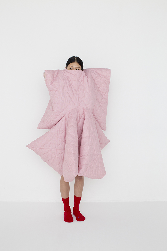 濱田「いかにも“これがチーズです”というかたちをしていたら展覧会のテーマは伝わりやすいけれど、着ぐるみをつくりたいわけではなかったんです。このシリーズは、あくまでも服にした時におもしろいディティールやシルエットを発見するために、ものからかたちをとって服と人体との関係性を探っていくという試み。元になったもののかたちがパッと見てわかることは、あんまり重要ではないんです」