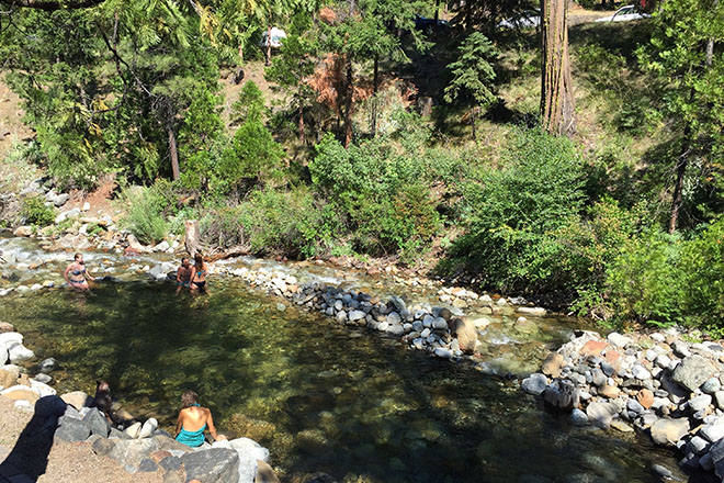 そこはカリフォルニア州北部にある、古くからネイティブアメリカンが「聖なる山」と呼ぶシャスタ山というパワースポットからさらに少し北上したウィードという街の山奥にあるスチュワート・ミネラル・スプリングス(Stewart Mineral Springs)という温泉施設です。こちらでは名前にもある通り、ミネラル分が豊富な鉱泉が湧いており、さらに薪を燃やして暖めるサウナと目の前を流れる川へのダイブ、という最強のコンボが体験できるのです。ただ、温泉と言ってもそこはやはりアメリカ。日本の山奥にある温泉施設のイメージとは一味も二味も違っていました。