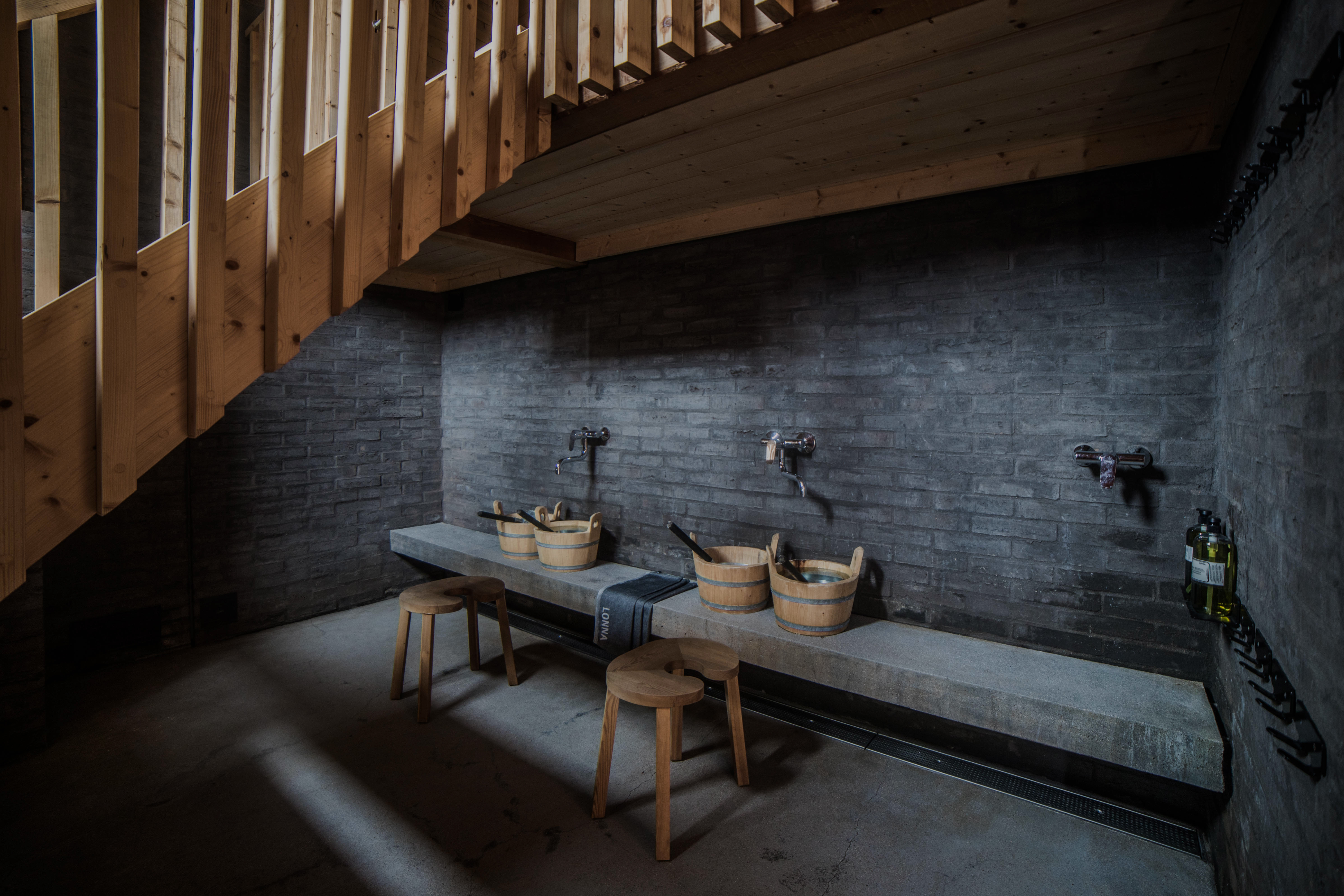 さて、水着に着替えてサウナ室のドアを開けると、薄暗い空間にいくつかの蛇口の下に木製のクラシックな桶が置いてあります。手前にひとつだけシャワーもあったのですが、どうやらここではオールドスタイルでの水浴びを推奨しているようなので、それに従い桶に水をためてかぶり、文字通り水浴びをして身体を清めてからサウナに入ることに。サウナはその水浴び場から階段で上った2階部分にロフトのような感じであります。階段を上るにつれ気温が高くなっていき、いい感じの予感がしてきます。ロフト部分に横に広がるサウナベンチに腰掛けると、目の前中央にある窓からは海が見え、暗いサウナ室内から見る外の明るい景色はまるで額装された美しい絵画のようです。最低限の照明で薄暗いサウナ室内はBGMも無く、ただただ目の前に海の景色が広がるだけ。たまに誰とも無くロウリュをしてくれて、静寂の中に「ジュワァァ〜〜〜」というサウナストーンの鳴き声が響き渡ります。そして、ここのサウナは全て薪で温められているサウナなので熱の肌当たりは優しくて、ひたすら無心で海を眺めているうちに心地よく発汗することができます。なんとも贅沢な時間です。