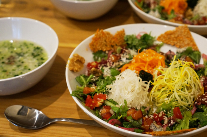 TABI食堂は食材に熱を加えずに生のまま調理する、いわゆるローフードのレストランだ。ある日のメニューは、「切り干し大根バーガー」。何かで和えてねっとりした食感になった切り干し大根を、ピタのようなものに包んで食べる。別の日は、「春のぶっかけ甘酒大根麺」。麺のように細長く切った大根を、常温の甘酒のスープにつけて食べる。偶然、大根が続いたけど、味の印象は全然違った。