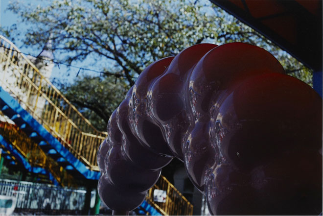 公園の遊具か何かだろうか、紫色のプラスチックの塊に、周囲の緑や光が鈍く反射している。鳥は真っ白な羽をこぼれるように生やしているが、顔も水面も真っ暗で闇のようだ。放置されたのか、古びたボートは少し浸水していて、なぜか船底から植物が長く伸びている。池の底なのか、泥がレイヤー状に浸食されていて、鄙びたような緑色になって沈んでいる。