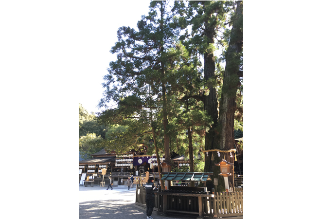 大神神社でもうひとつ知られるのが、「巳の神杉」の名で知られる、杉の巨木だ。三輪山に宿る大物主大神は蛇に姿を変えて現れることもあったといい、「この杉の根元の洞には白蛇が棲む」という言い伝えから、杉そのものも祈りの対象となった。蛇は水神、雷神、農業や五穀豊穣の神とされるが、この杉も似たような意味をもたらされたのだろう。