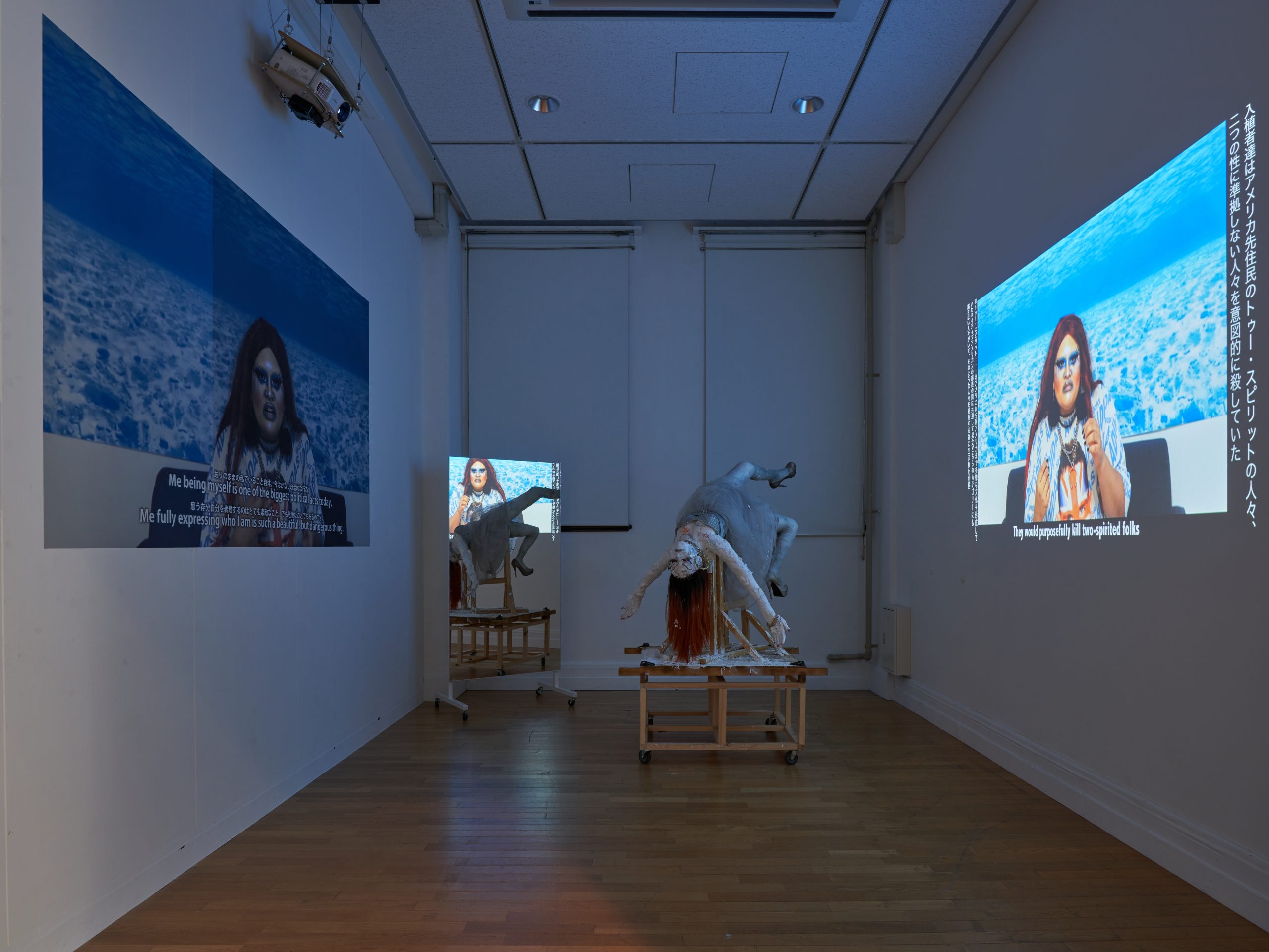 本展のメインビジュアルでもある、北アメリカの先住民族が「Two-Spirit」と呼ぶ男女に二分されないジェンダーを持った人物が現れ、まるで政見放送のようなポジションで、社会の中の自身の不安定な立場について訴えかける。