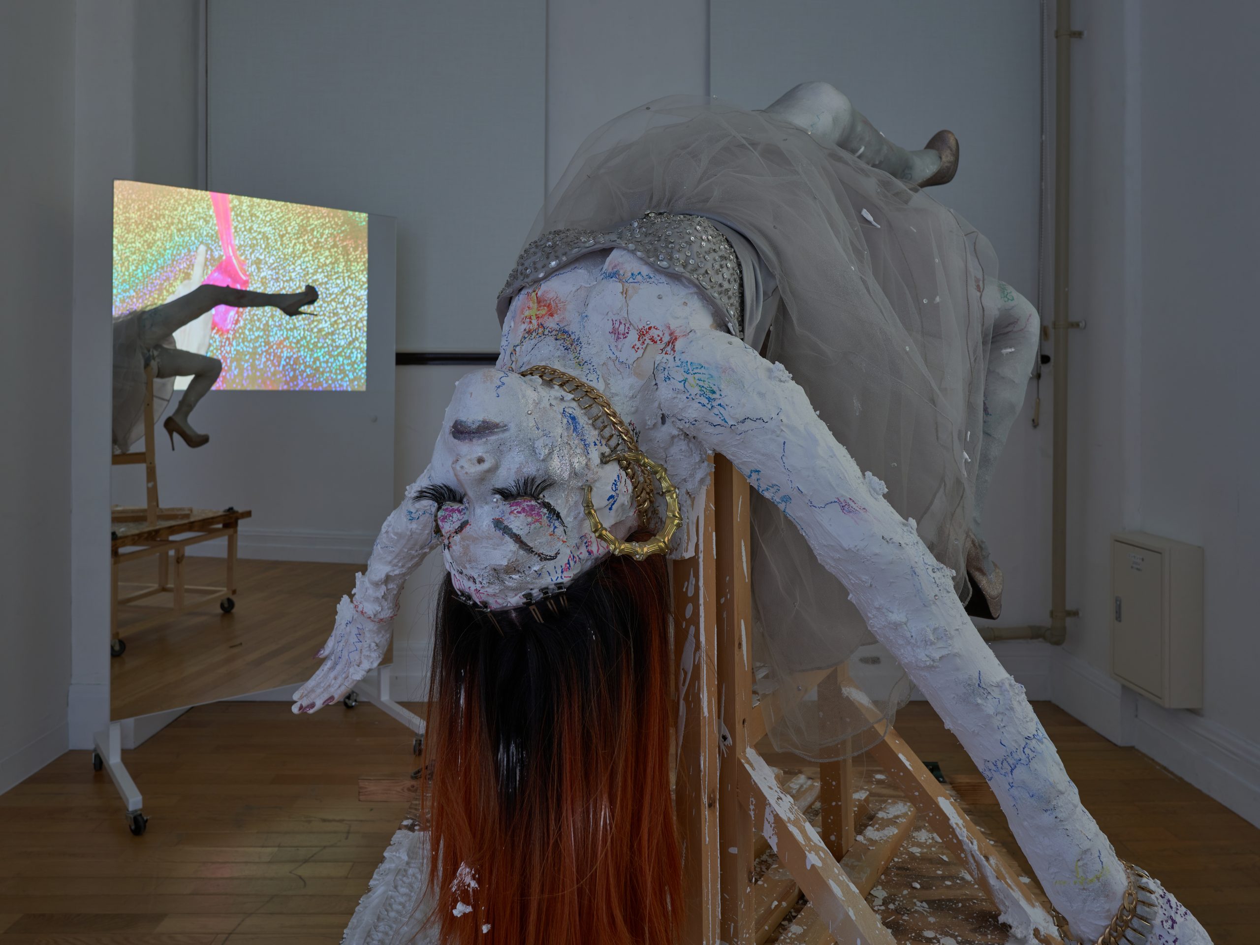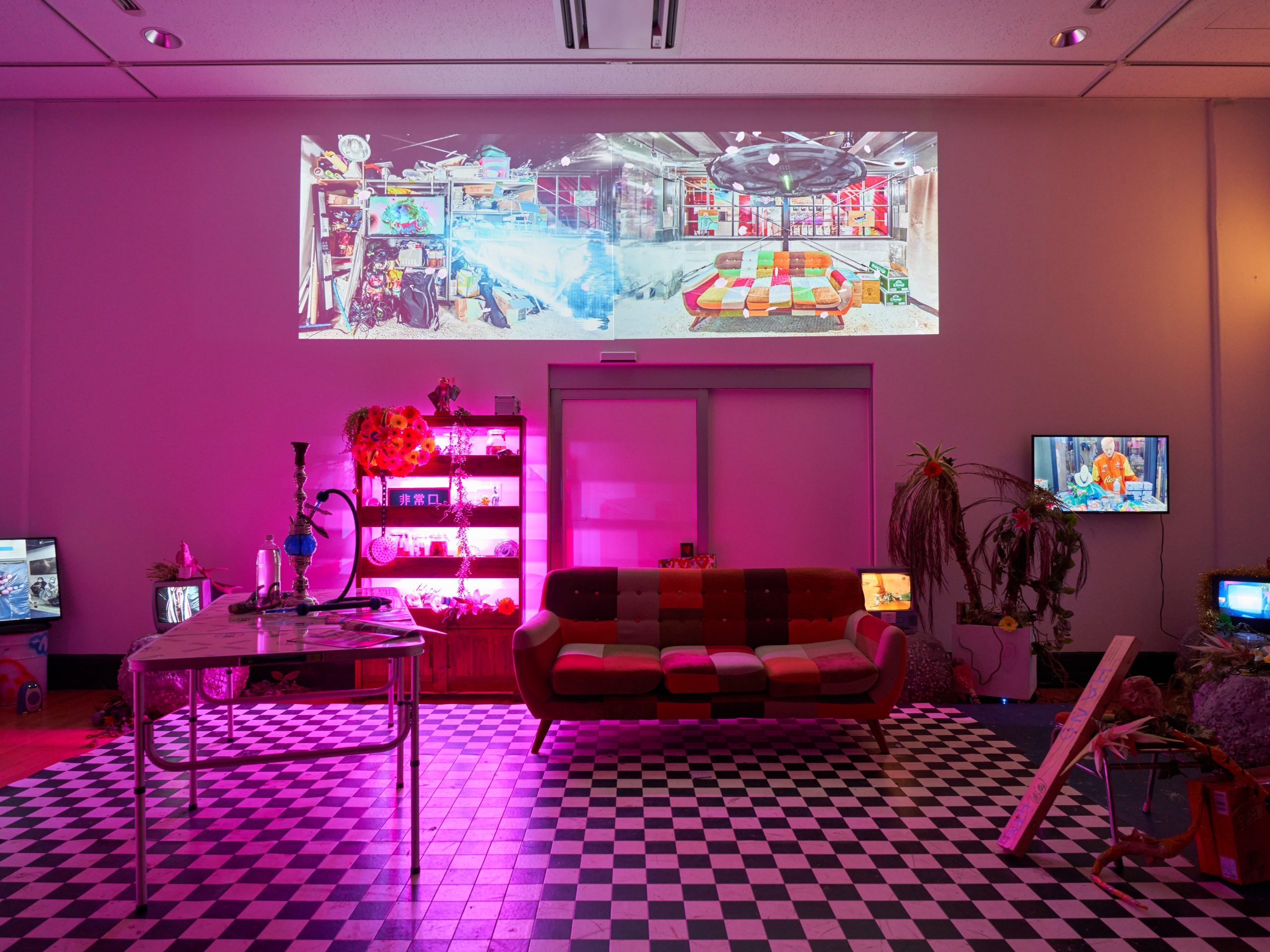 本作の展示は、コロナ禍に見舞われ、店を畳むまで彼女が営んでいたスナックの色褪せた「奴隷の椅子」に腰かけて、映像を観るようしつらえられている。モニターの映像は常に不穏なバグでグロテスクに歪み、自虐的なユーモアに彩られた語り口に皮肉めいた凄みを与える。自身も波乱の少年時代を送った作家が「スラム魂」と標榜する、「ディスりあって笑い合う、死なないようにするみたいなメンタリティ」(松田)の強かさが全編に満ちていた。