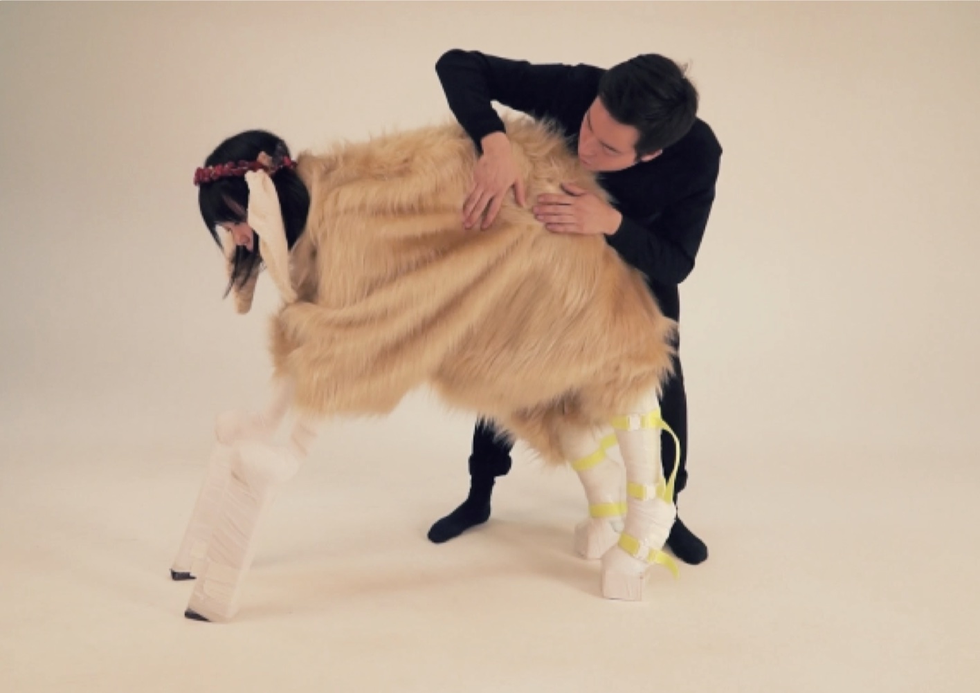 映像の中で作家が扮する山羊は、拘束された四肢がぐらぐらと揺れ、かたく目を瞑ったまま、1人の男性に無言で毛をむしり取られ続ける。無機質な白い空間で延々と演じられるパフォーマンスからは不条理な暴力性が痛いほど伝わる。不自由な身体から意図と異なる動きが生まれるパフォーマンスを振り付けする上で、土方巽やルドルフ・フォン・ラバンについてリサーチし、振付を言葉で記譜した「舞踏譜」を参照したそうだ。