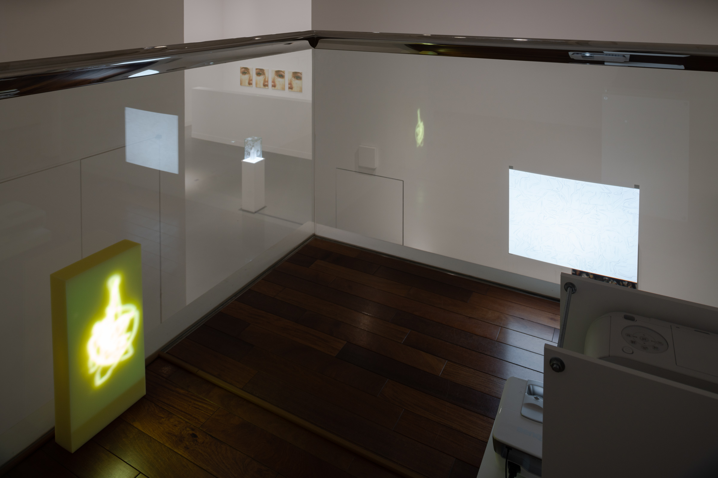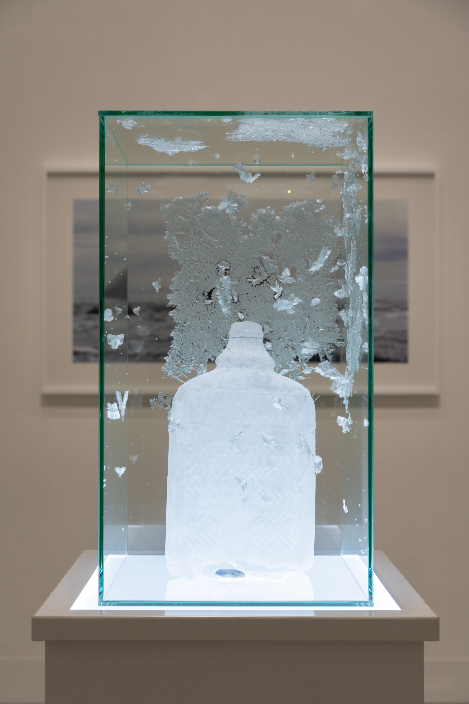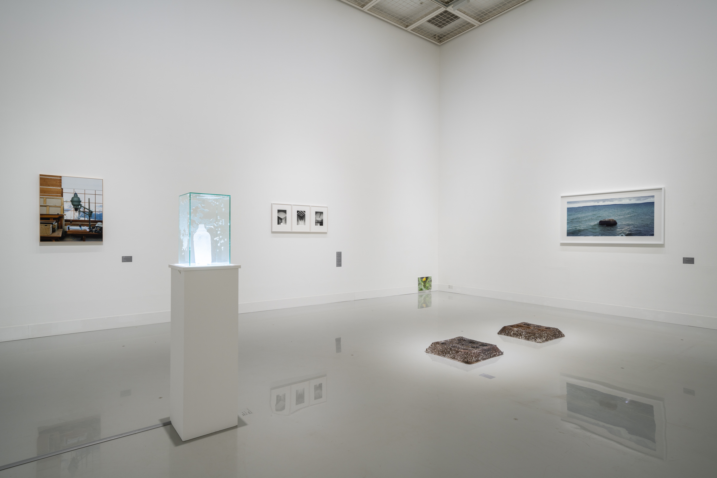氷河から目覚めたタイムカプセルのようなこの石が異なる場所で存在し続けるありように、人の生活にも似た変成を見出した宮永は、自身の変成するナフタリンの彫刻を対峙させた。いっぽうでは、硬質で重量のある素材とは思えないほど、しなやかに柔らかく彫刻をとらえる青木の観点に触発され、宮永は海を漂うメッセージボトルのような彫刻を、と考えたという。これら3点の作品の背景には、畠山が旅先のホテルのランプシェードの光で部屋(CAMERA)の天井を照らし出した≪CAMERA≫シリーズが設置され、土地の風景や物質に封印されたさまざまな記憶が光と共に揮発し蒸散していくようにも思われた。