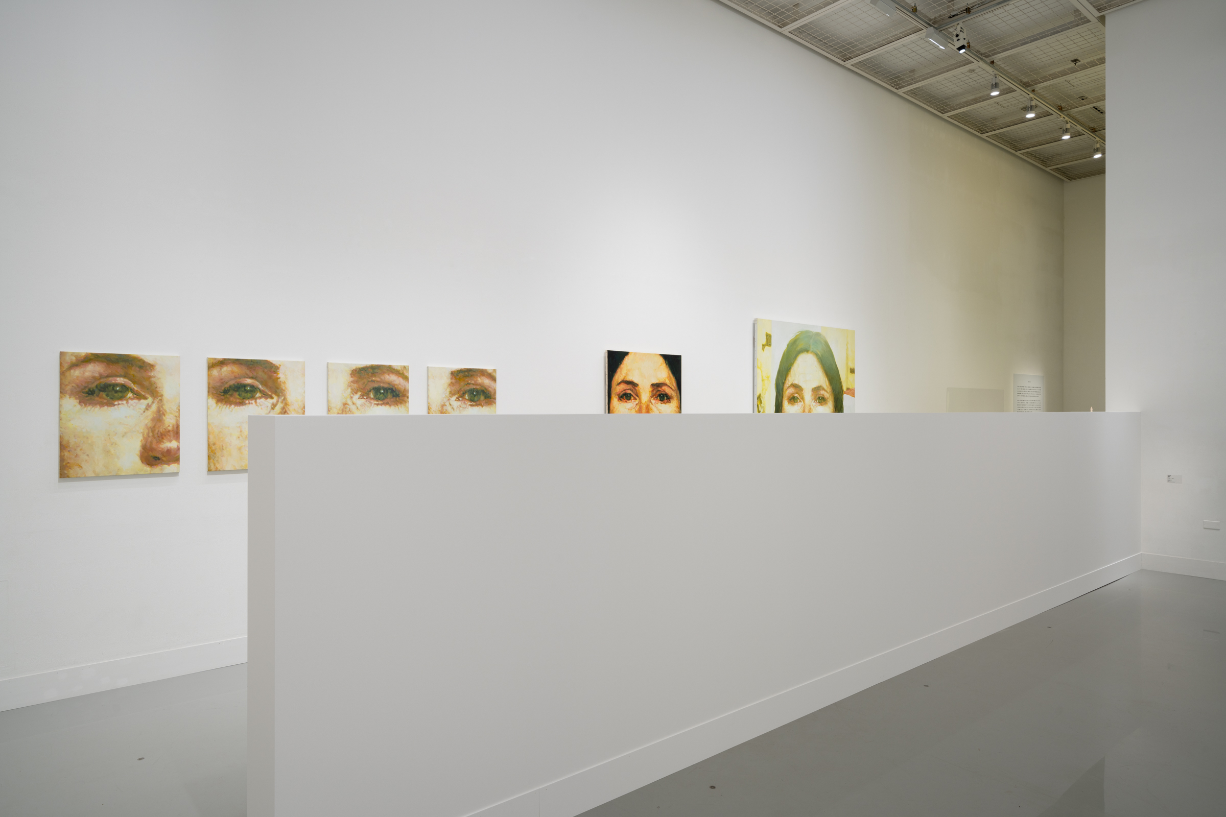 ちょうど三輪の描いた女性像の目の位置と、内藤の小さなひとを覗き込む観客の目線に合わせた高さの仮設壁をしつらえ、何気ないいたずらのような介入のなかで、作品同士が語り合うかのような関係性を立ち上がらせている。