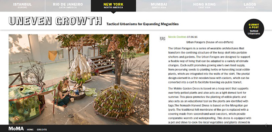 「タクティカル・アーバニズム」は、主にアメリカから始まって、現在では日本にも普及している動きだ(2014年にはMoMAでこのテーマを扱った展覧会『Uneven Growth』が開催されている)。例えば、街路樹が植えてある、土が露出した場所のように、誰も関心を持たないような街の一角に、人知れず野菜や果樹の種を撒いて育てるゲリラ・ガーデニング。ストリート・アートのように道路にステンシルやスプレーでサインを施して、勝手につくった自転車レーン。空いた駐車場を利用したオープン・カフェや野外映画館。いずれも都市の構造そのものを破壊するまでには至らないが、自分たちで既存のインフラをアレンジしながら、長期的な視点にもとづいて、街という空間に潜んでいたさまざまなアクセスの回路を解放している。