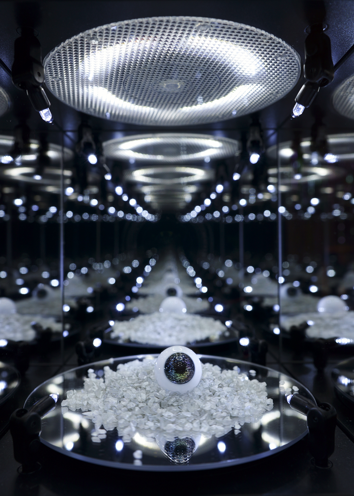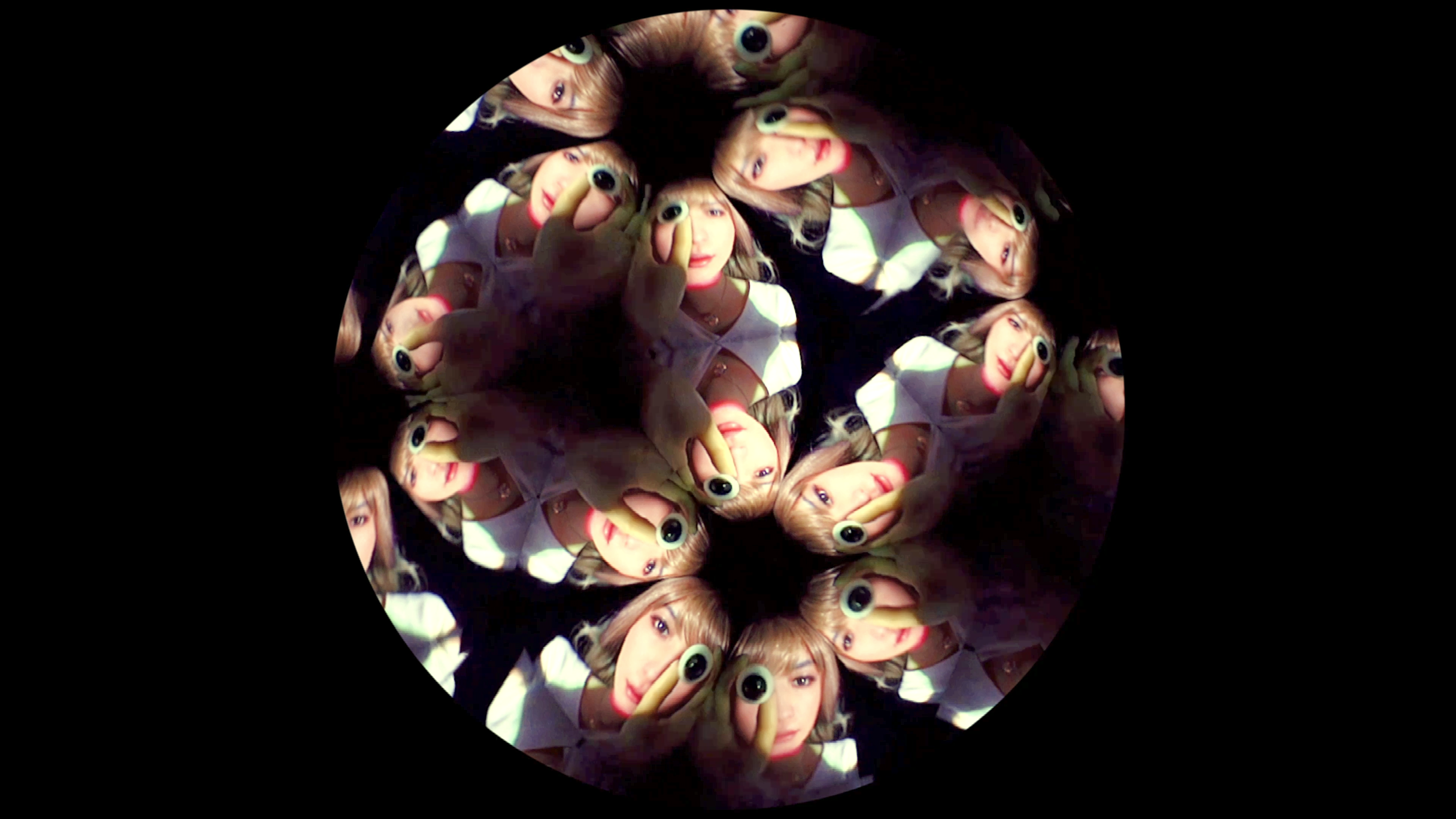 大展示室では、壁を埋め尽くすセルフポートレートに囲まれた巨大な万華鏡にも似た空間に、さらに人工水晶を使用した自作の遠華鏡(テレイドスコープ)を通して、ガラスの眼球を持つ人形を撮影した映像が投影される。双子のように見分けのつかない菅実花と人形、いずれ劣らぬ美しさを持つ生花と造花、そして人形のグラスアイがめくるめく無限ループに幻惑されることとなる。